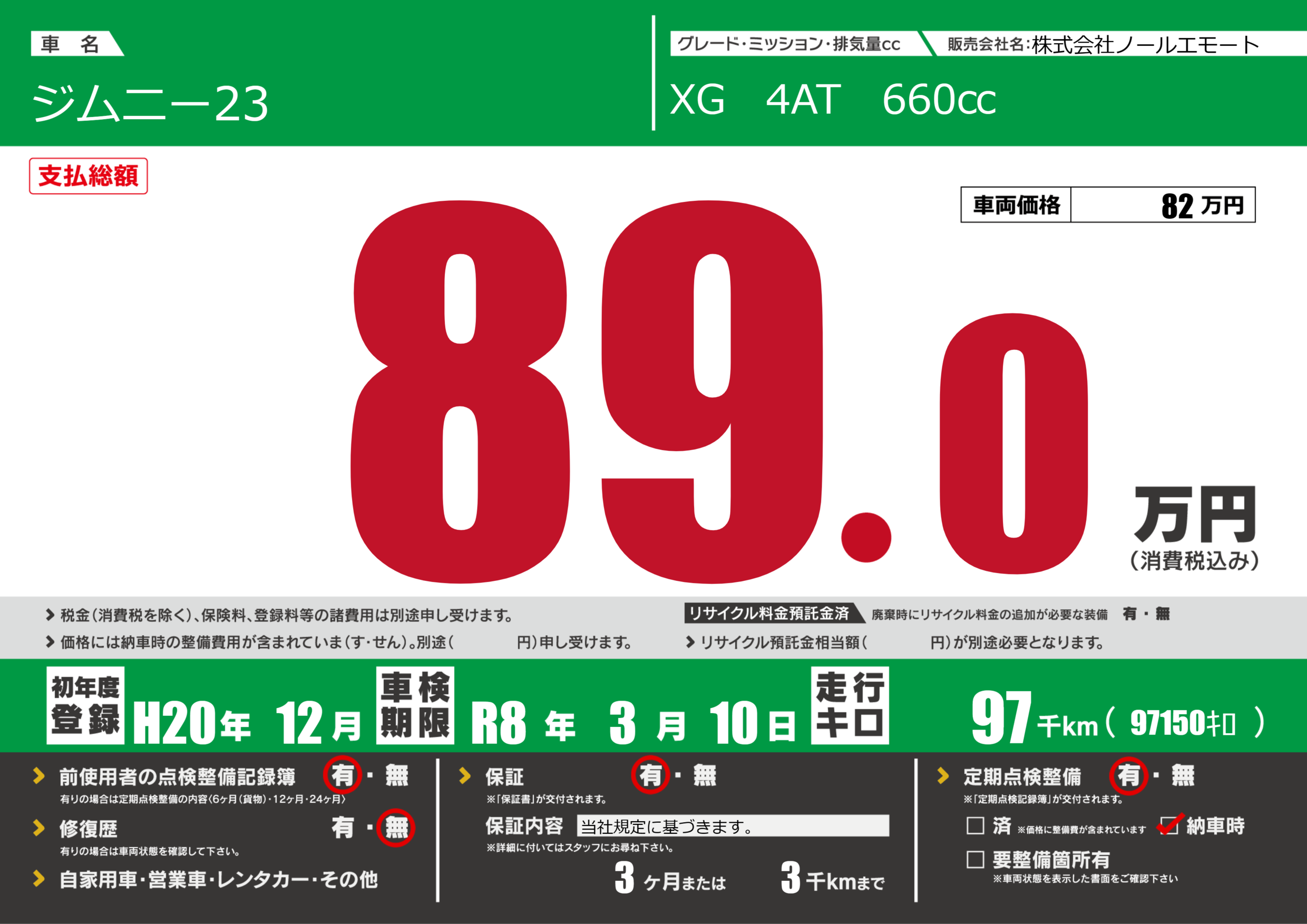 保証付き 保証内容(当社規定に基づきます。) 3ヶ月または(3)千kmまで |