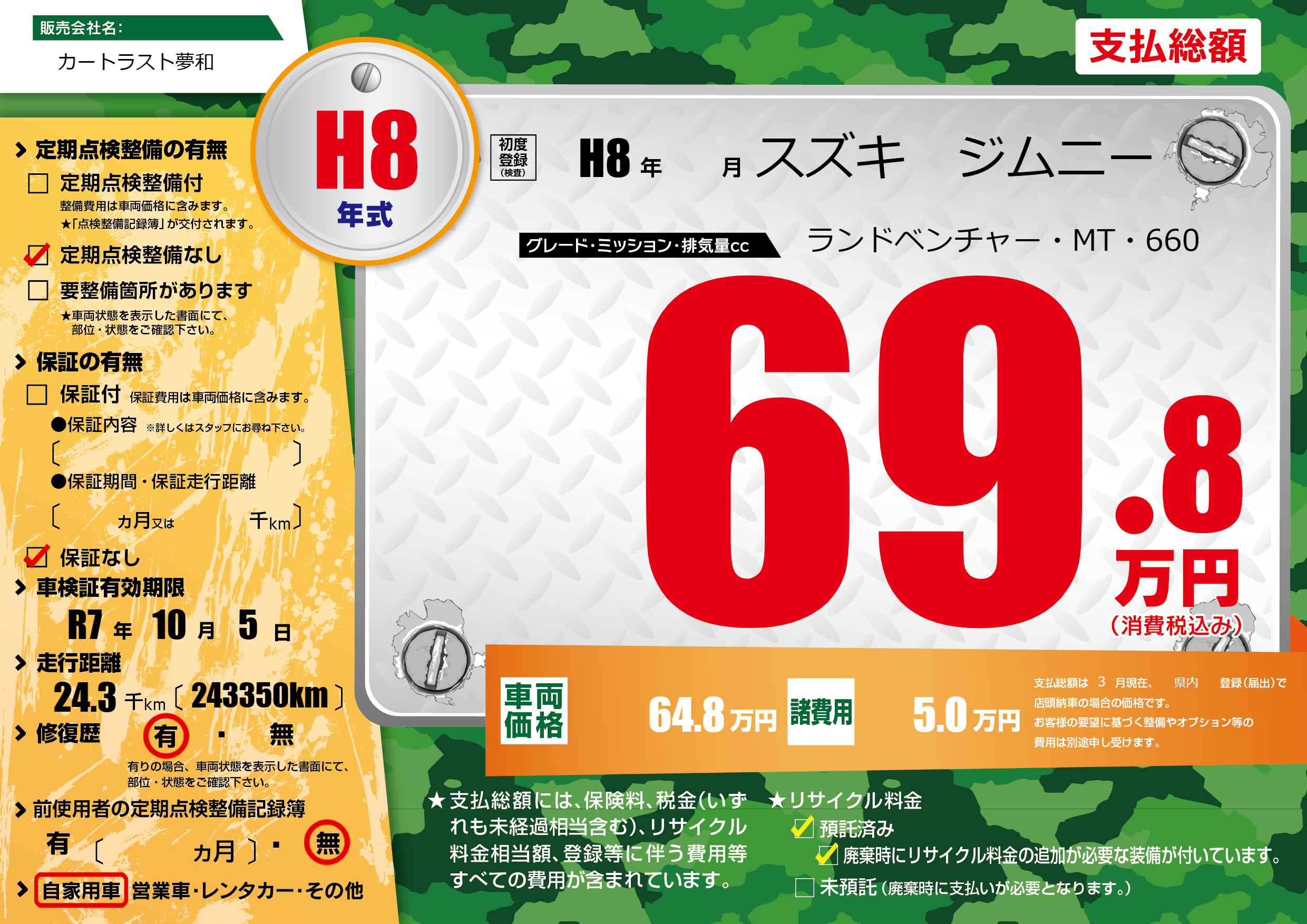 | 車検制限 | R7年 10月 5日 | ||