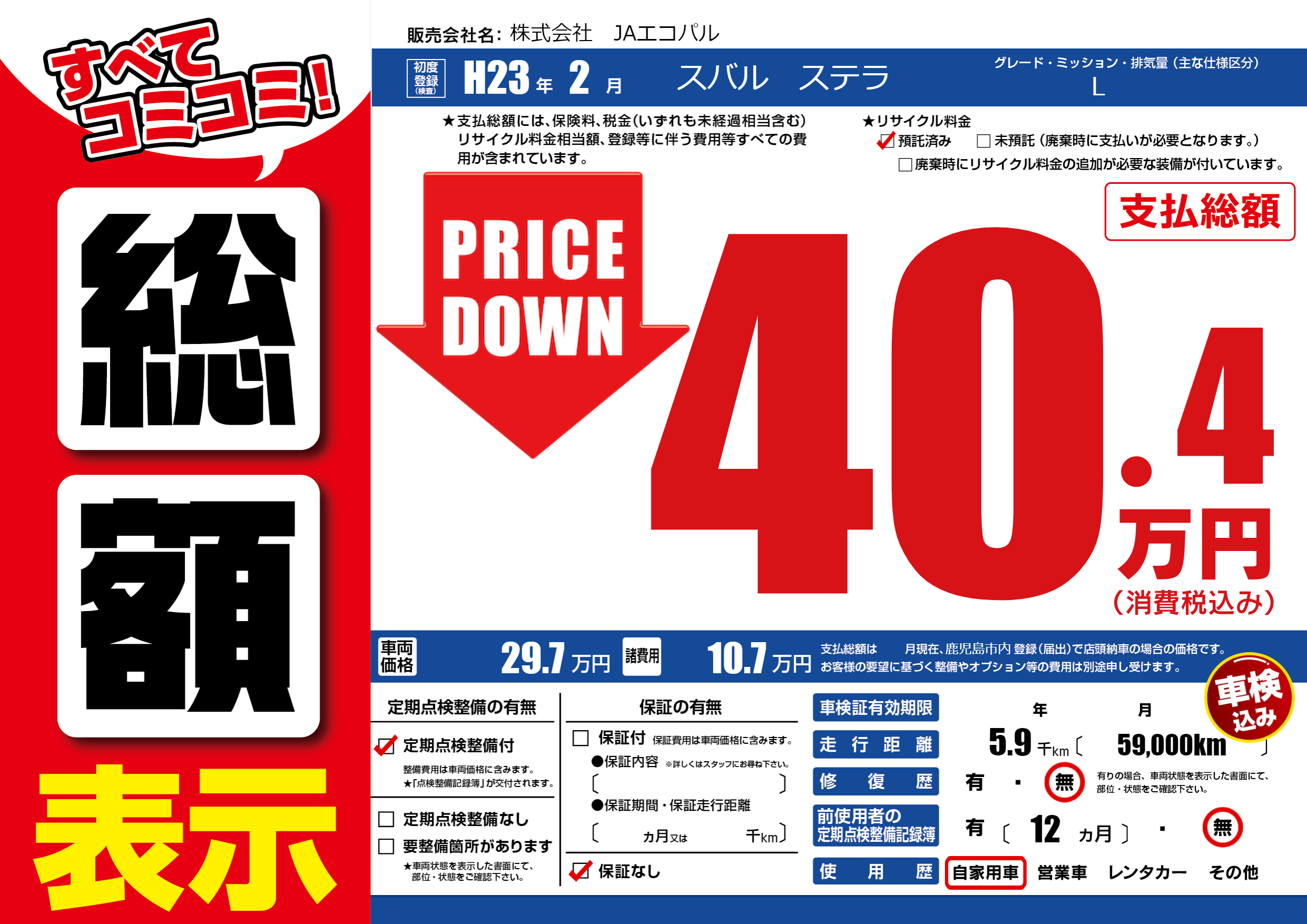 | 車名 | スバル ステラ | グレード ミッション 排気量 |