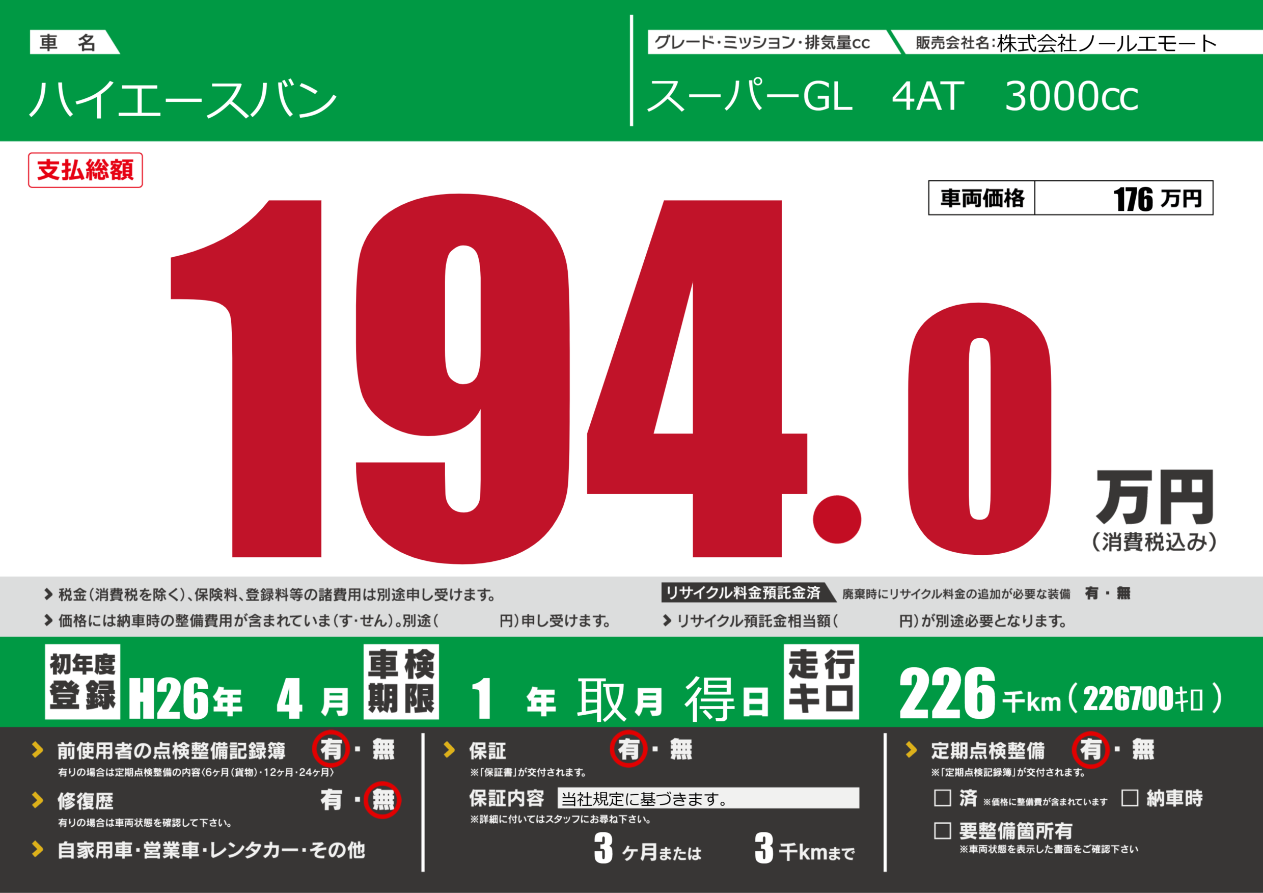 | 車名 | ハイエースバン | グレード ミッション 排気量 |