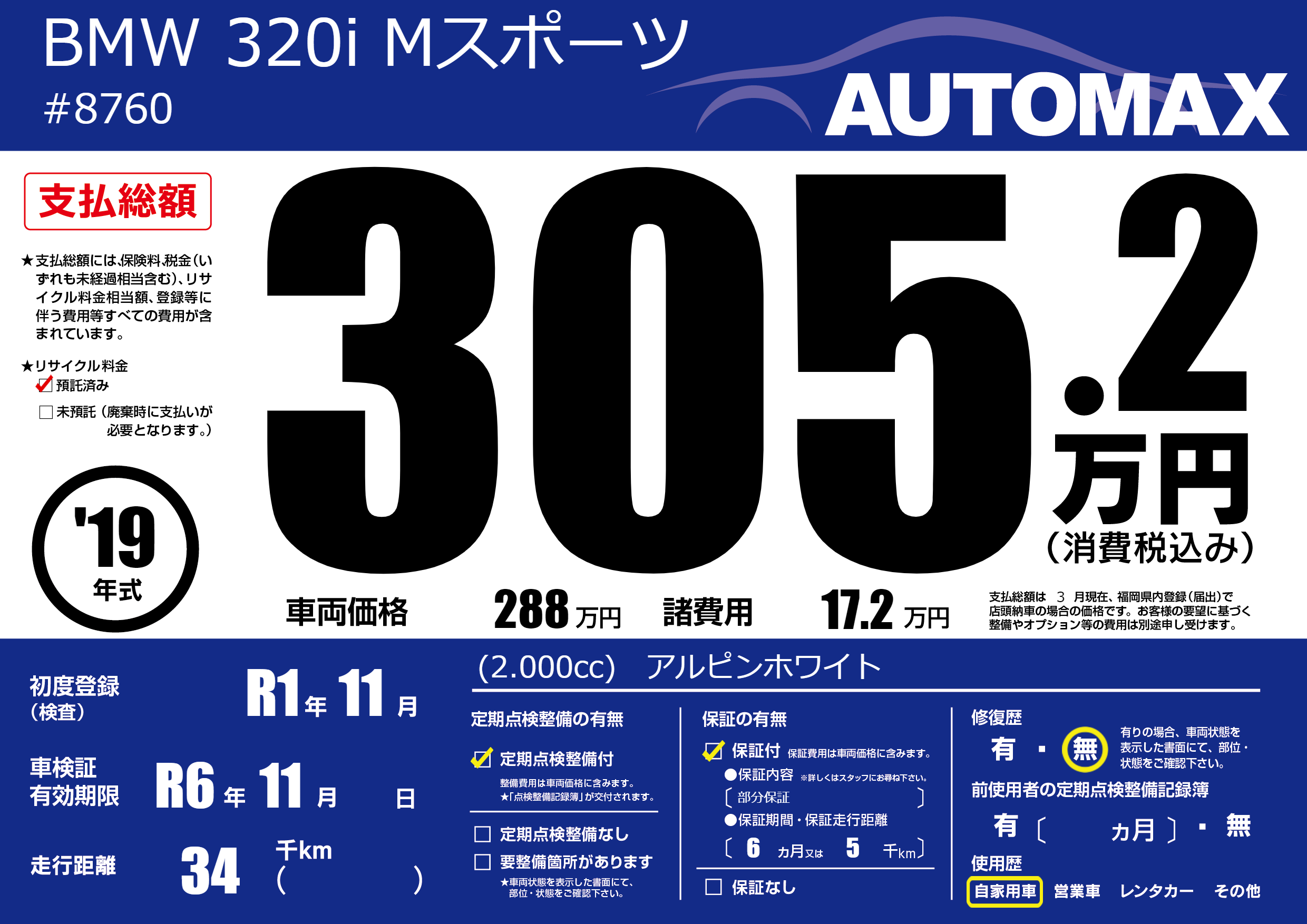 | 車名 | BMW 320i Mスポーツ | グレード ミッション 排気量 |