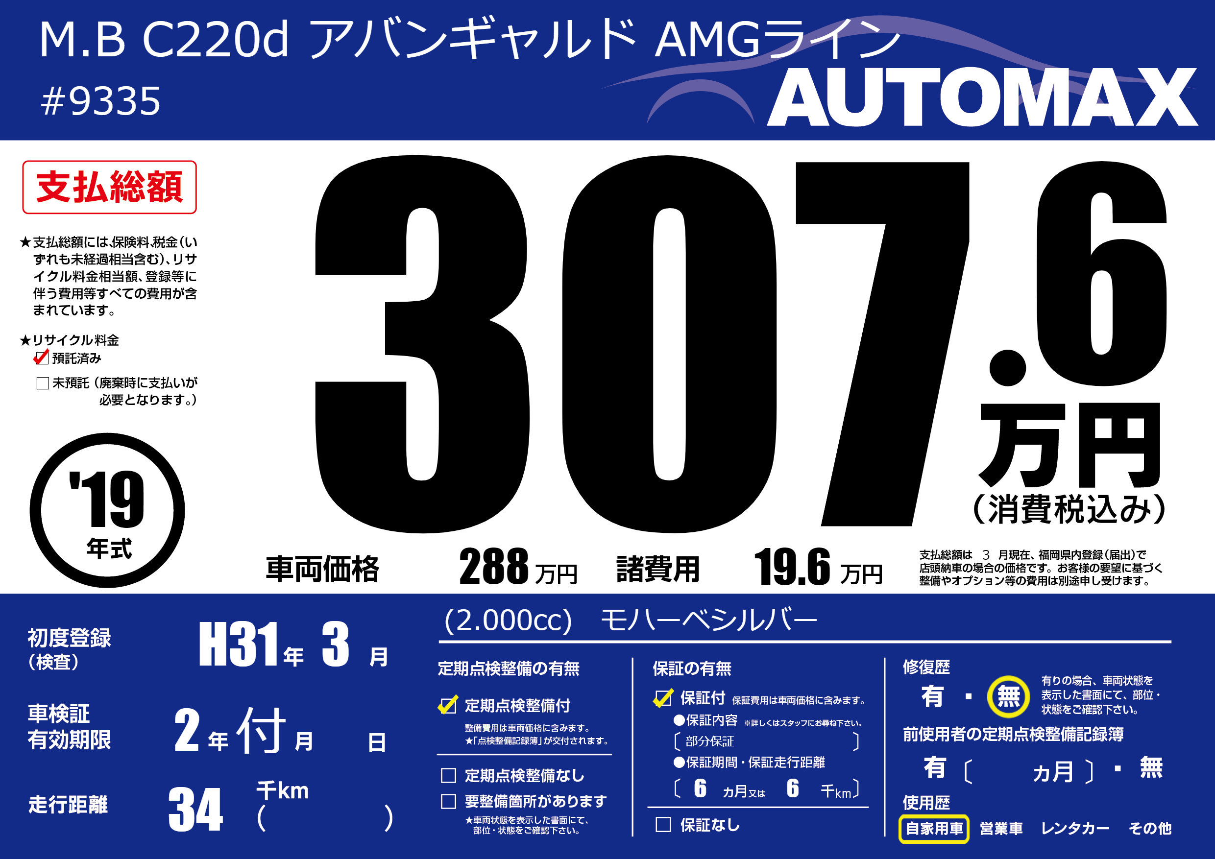 | 車名 | M.B C220d アバンギャルド AMGライン | グレード ミッション 排気量 |