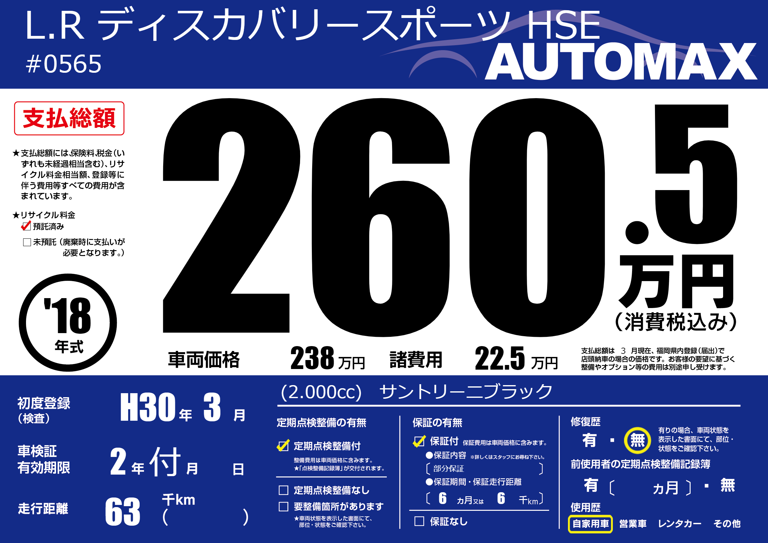 | 車名 | L.R ディスカバリースポーツ HSE | グレード ミッション 排気量 |