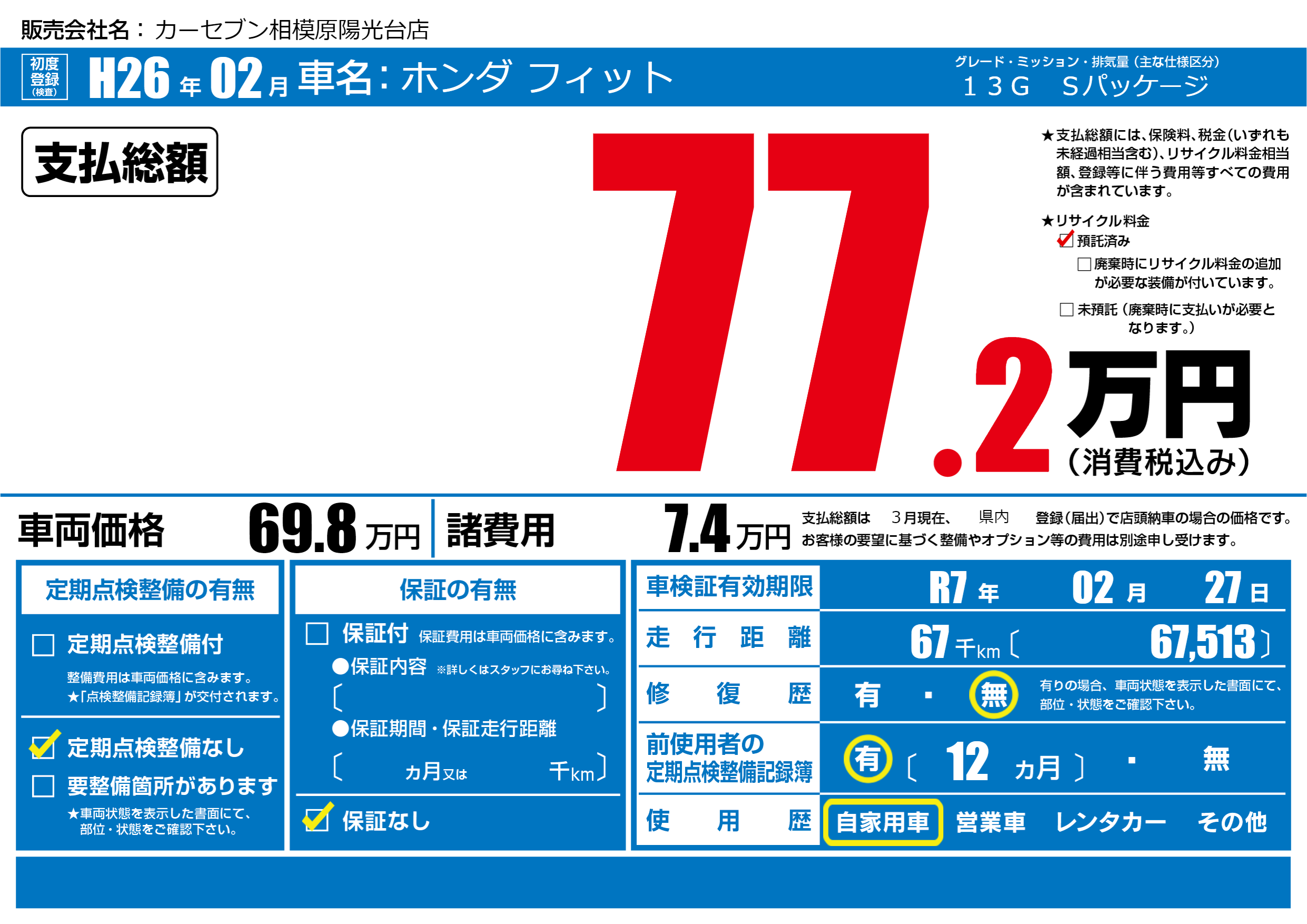 | 走行キロ | 6.7万km | 初年度登録 | H26年02月 |