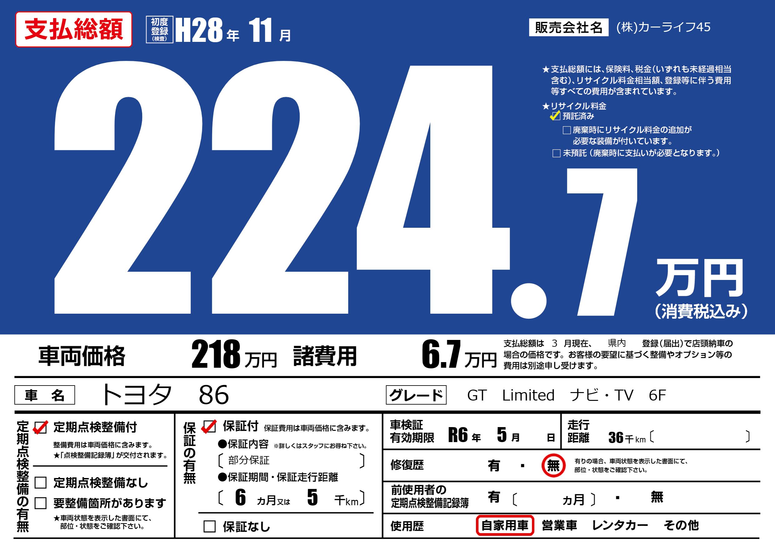 | 車名 | トヨタ 86 | グレード ミッション 排気量 |