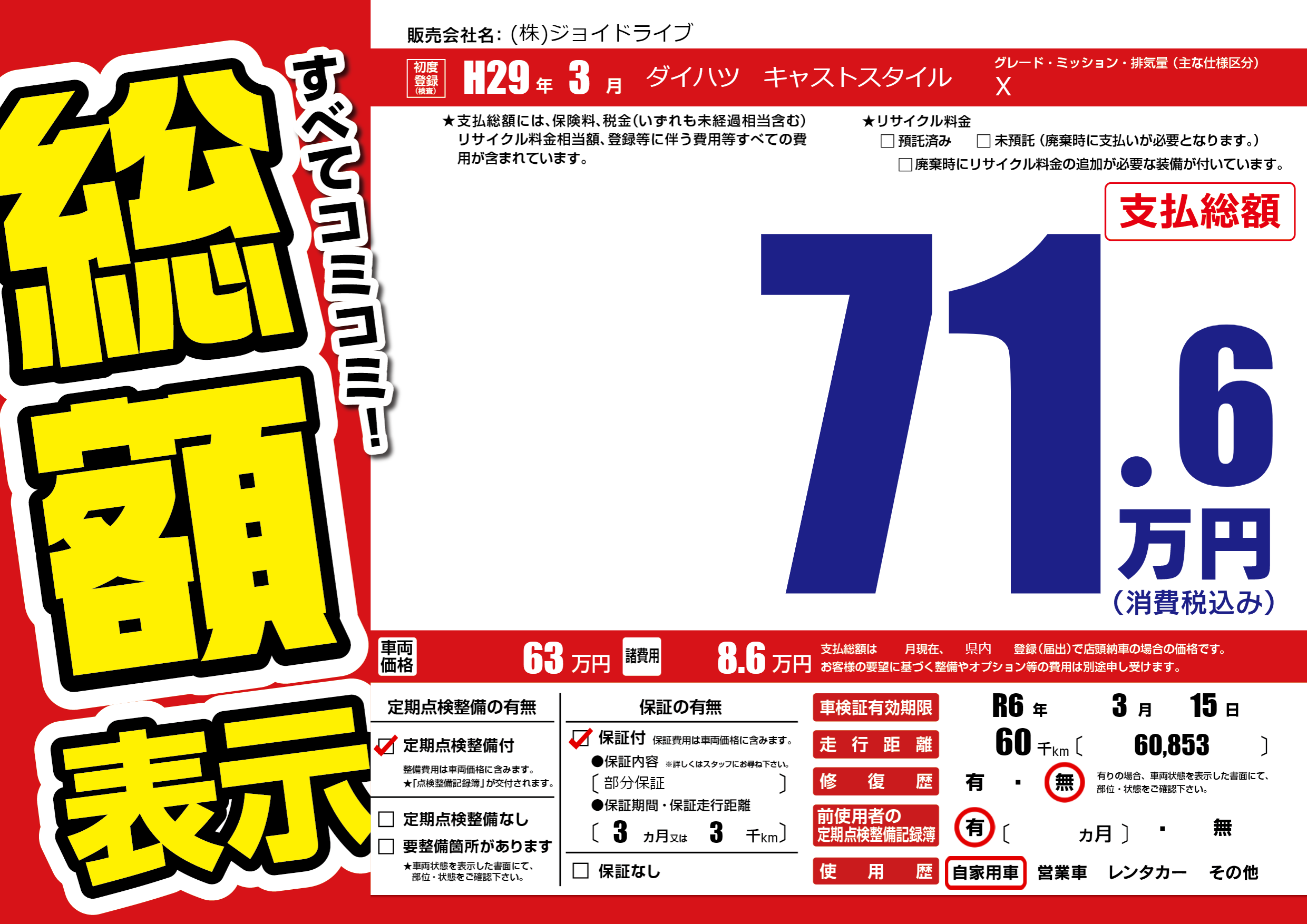 | 車名 | ダイハツ キャストスタイル | グレード ミッション 排気量 |