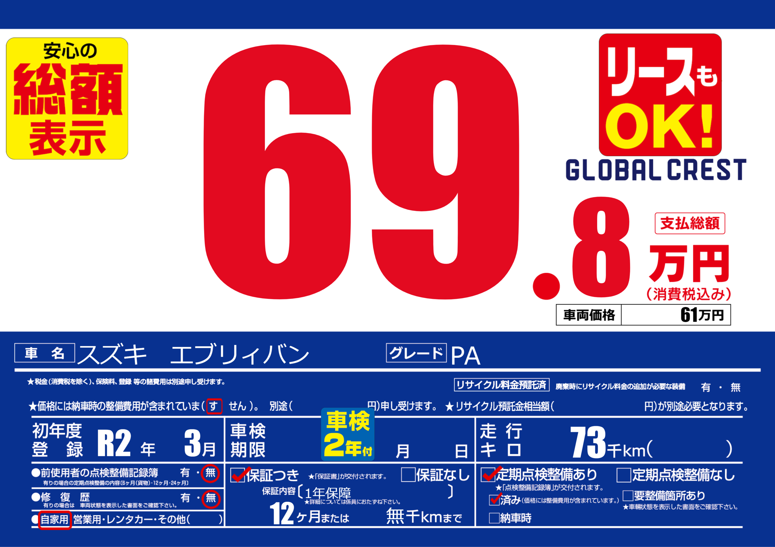 | 定期点検整備 | 定期点検整備あり 定期点検整備済み | ||