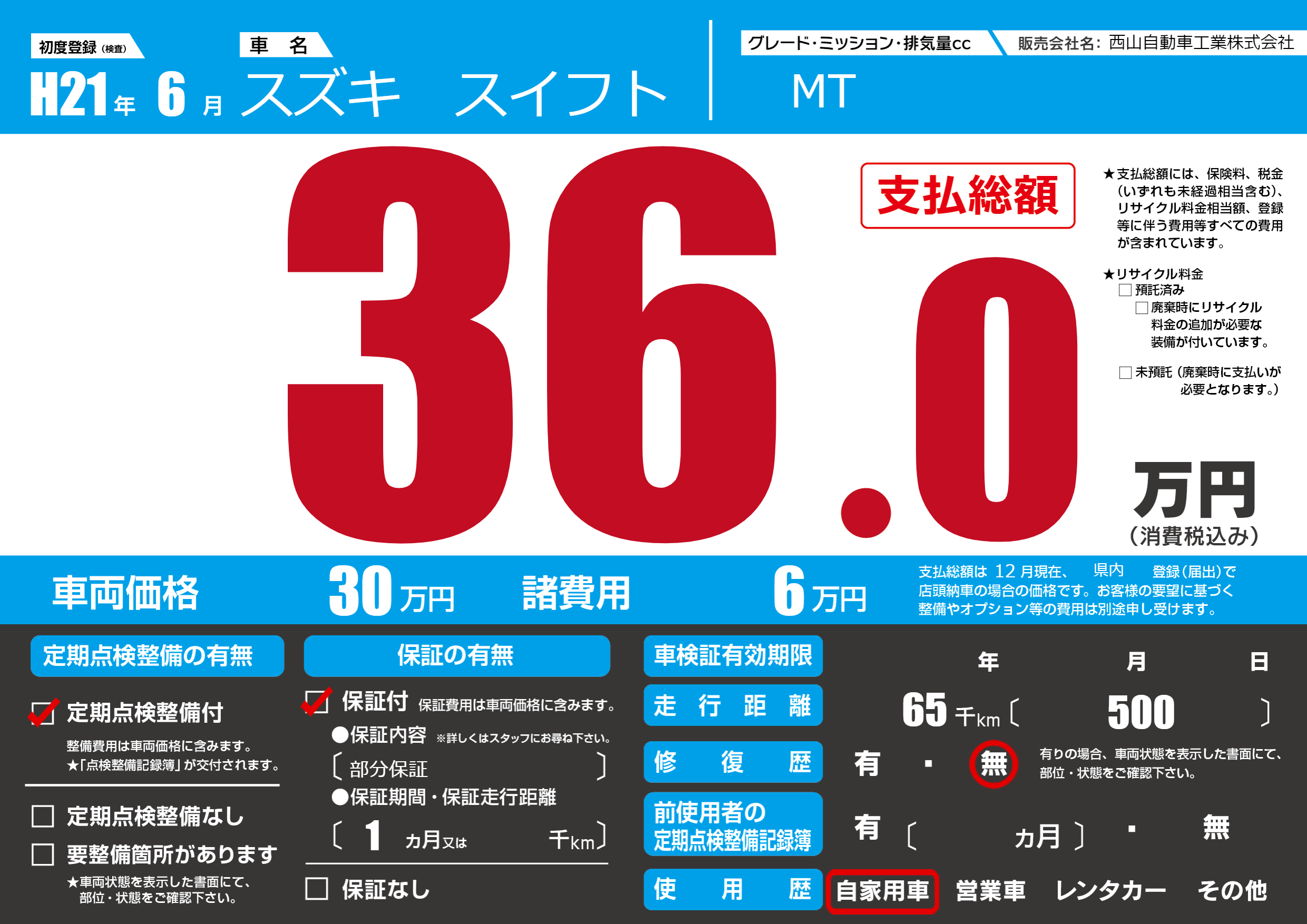 | 走行キロ | 6.5万km | 初年度登録 | H21年6月 |