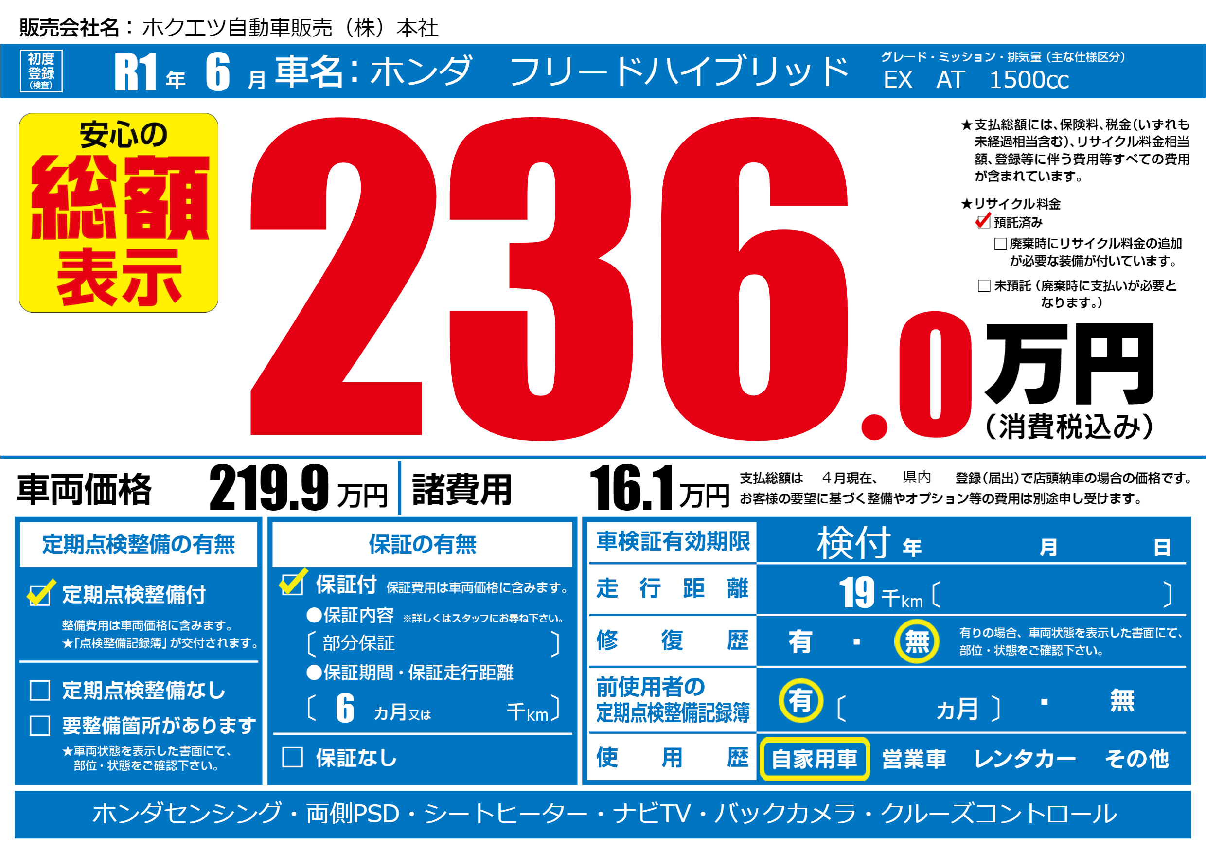 | 車名 | ホンダ フリードハイブリッド | グレード ミッション 排気量 |
