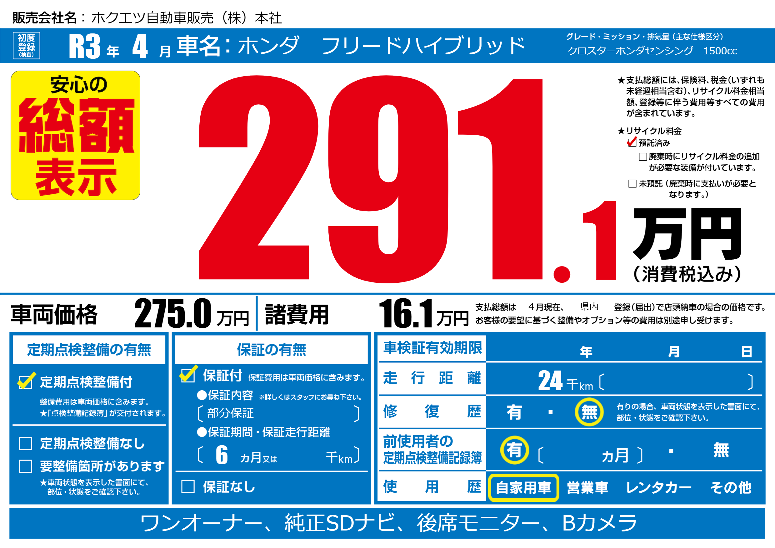 | 車名 | ホンダ フリードハイブリッド | グレード ミッション 排気量 |