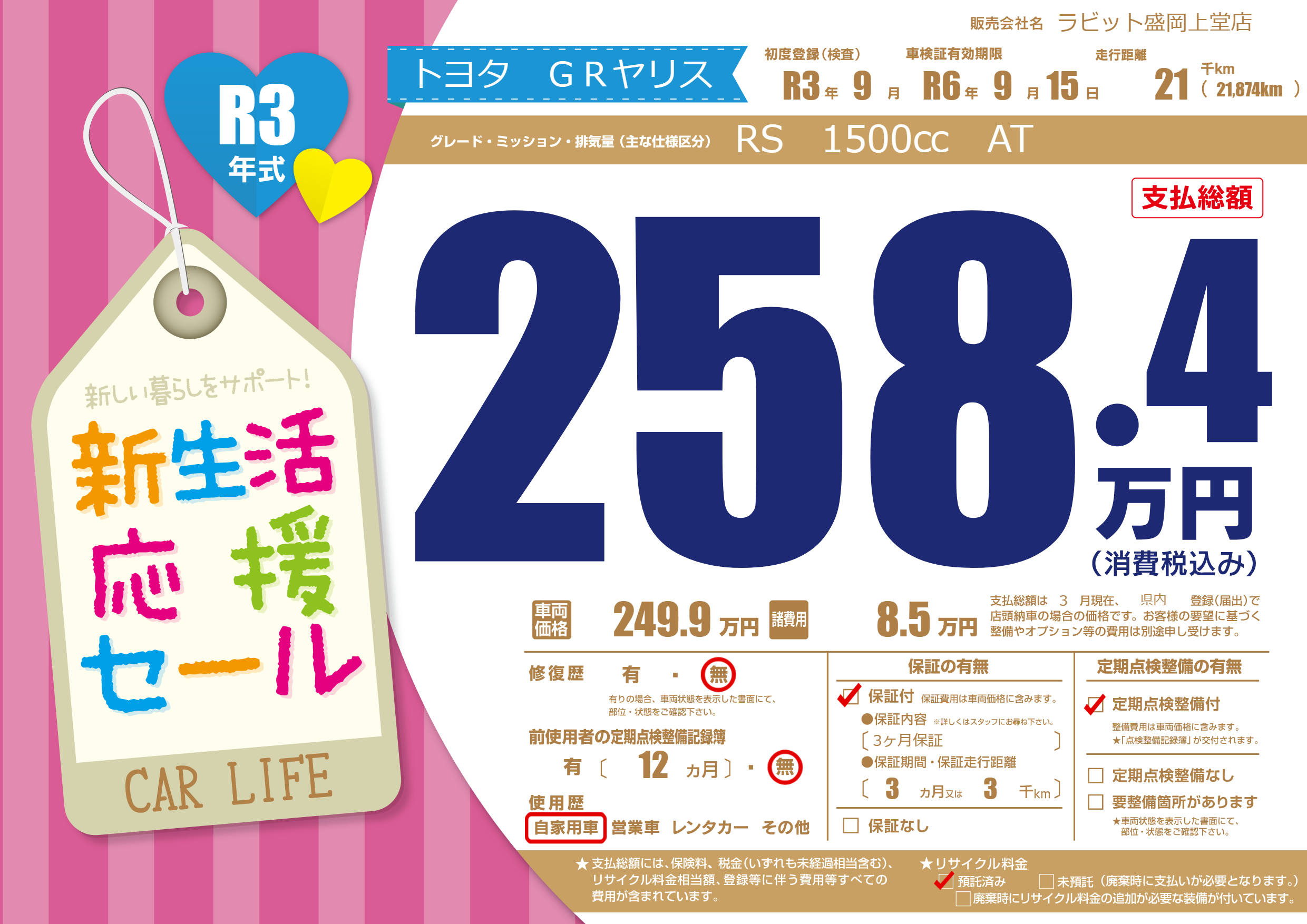 | 走行キロ | 2.1万km | 初年度登録 | R3年9月 |