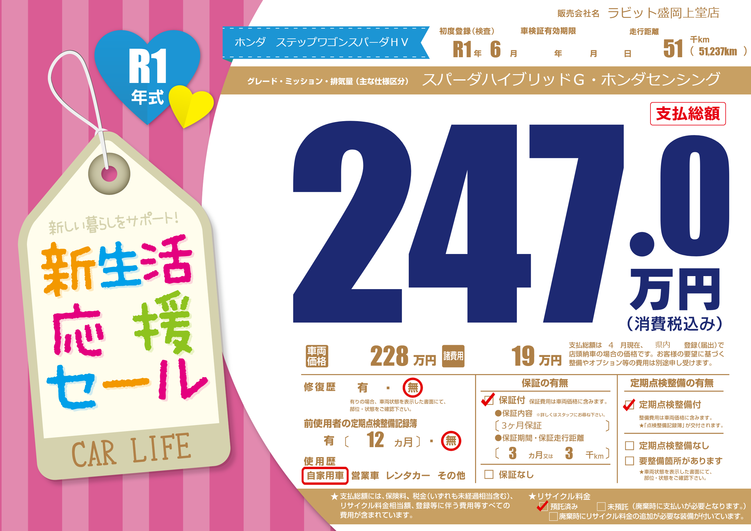 | 走行キロ | 5.1万km | 初年度登録 | R1年6月 |