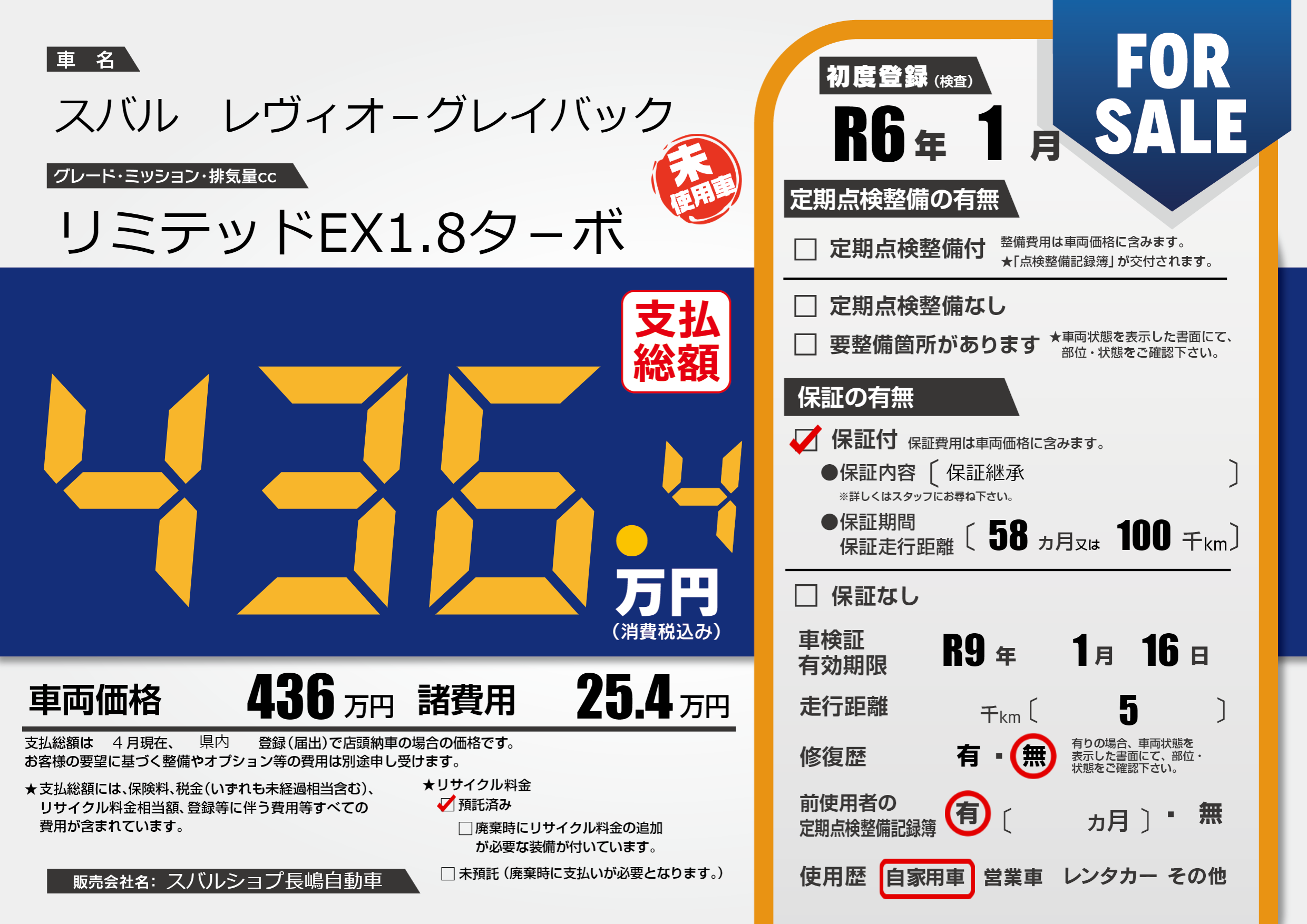 | 車名 | スバル レヴィオ-グレイバック | グレード ミッション 排気量 |