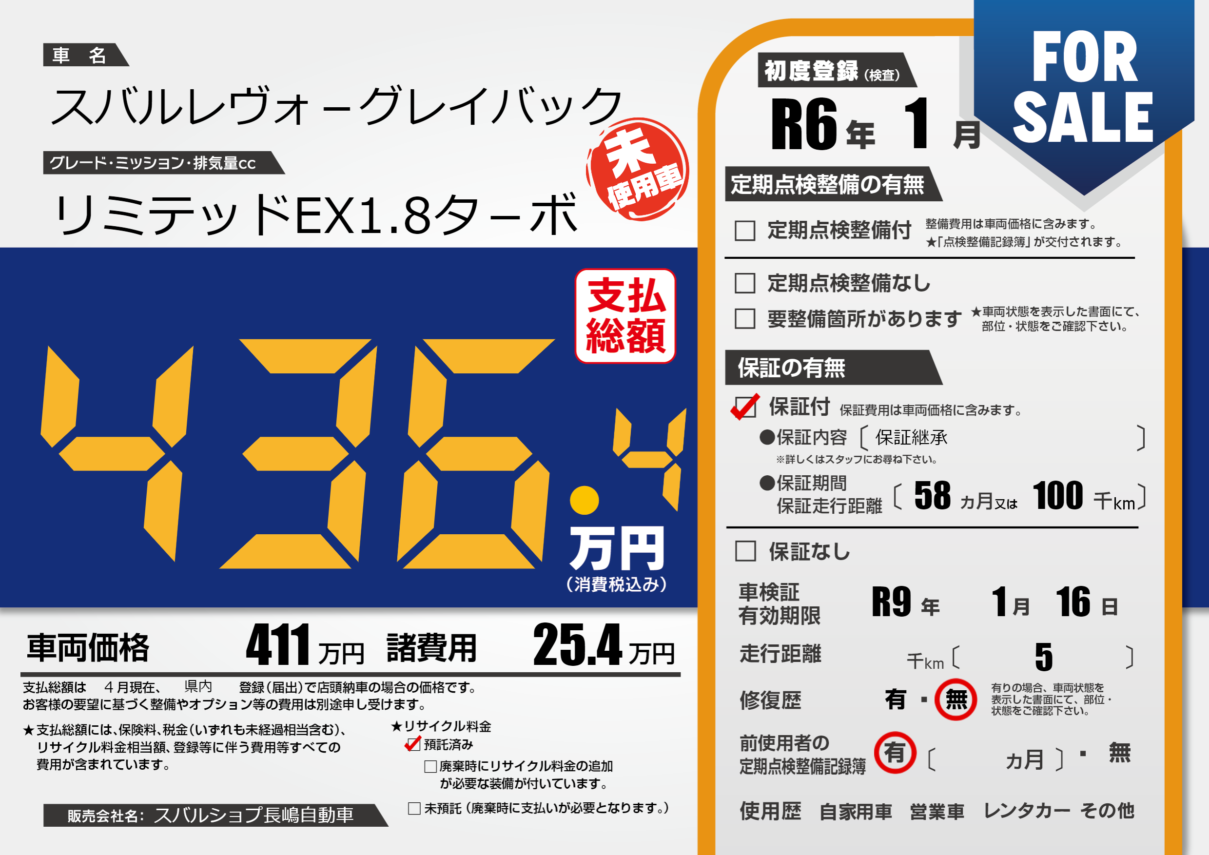 | 車名 | スバルレヴォ-グレイバック | グレード ミッション 排気量 |