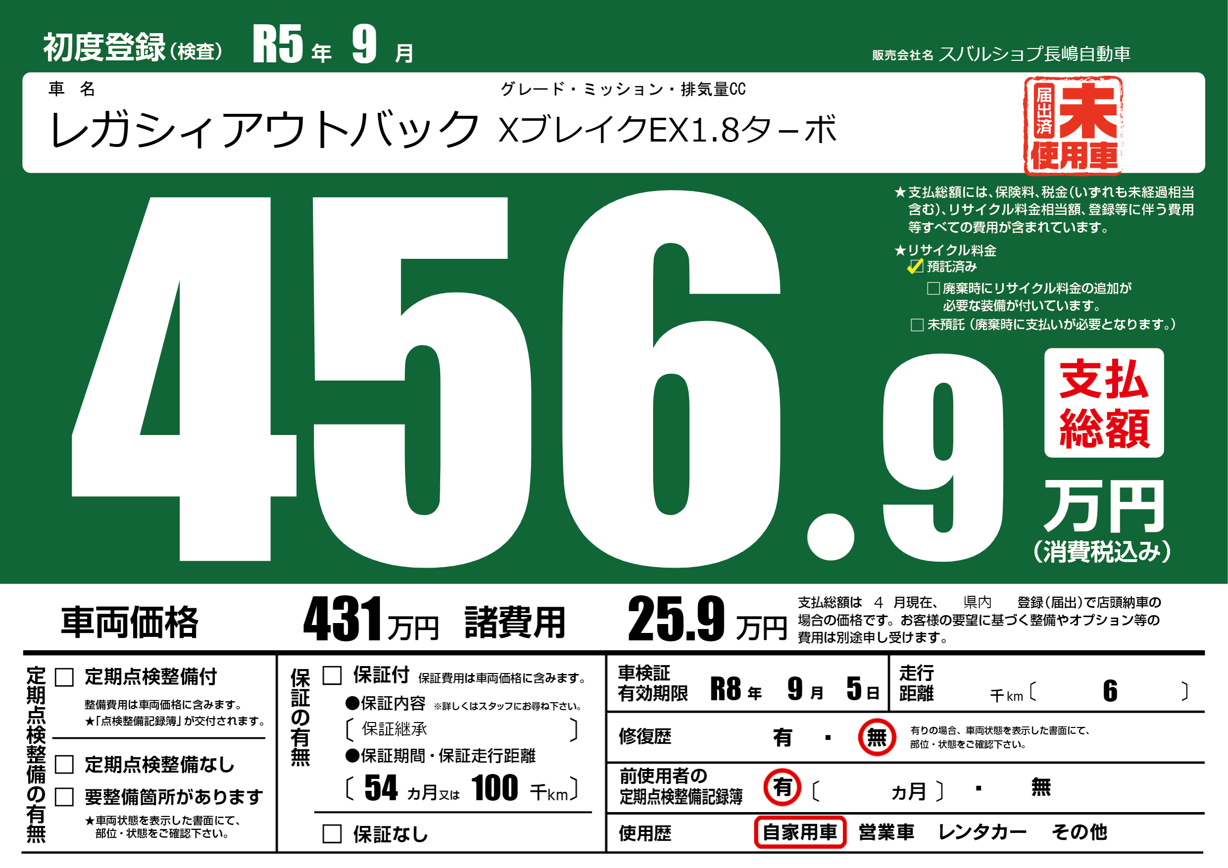 | 車名 | レガシィアウトバック | グレード ミッション 排気量 |