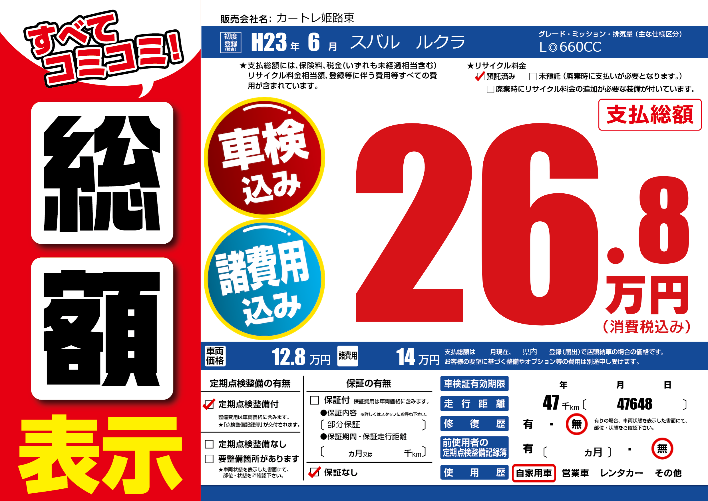 | 走行キロ | 4.7万km | 初年度登録 | H23年6月 |