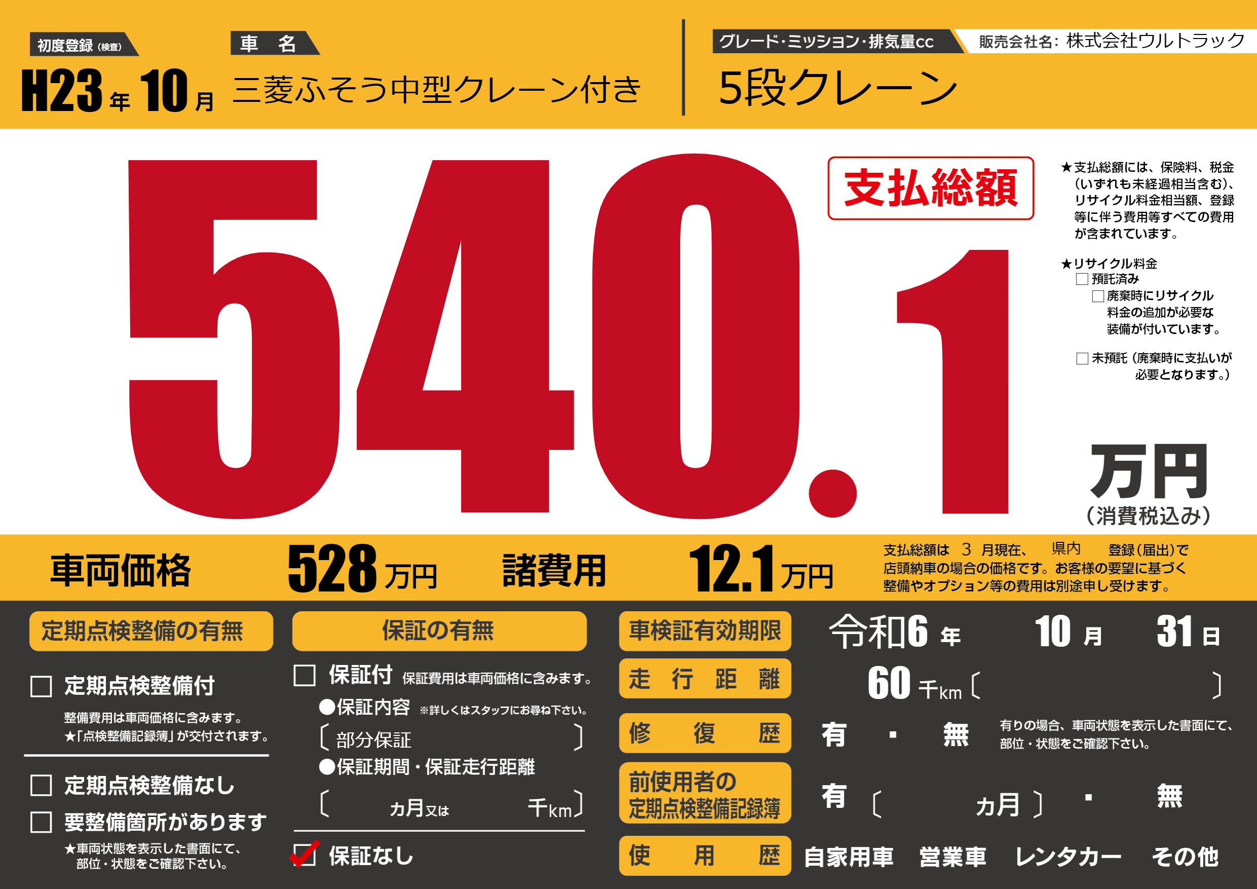 | 車名 | 三菱ふそう中型クレーン付き | グレード ミッション 排気量 |