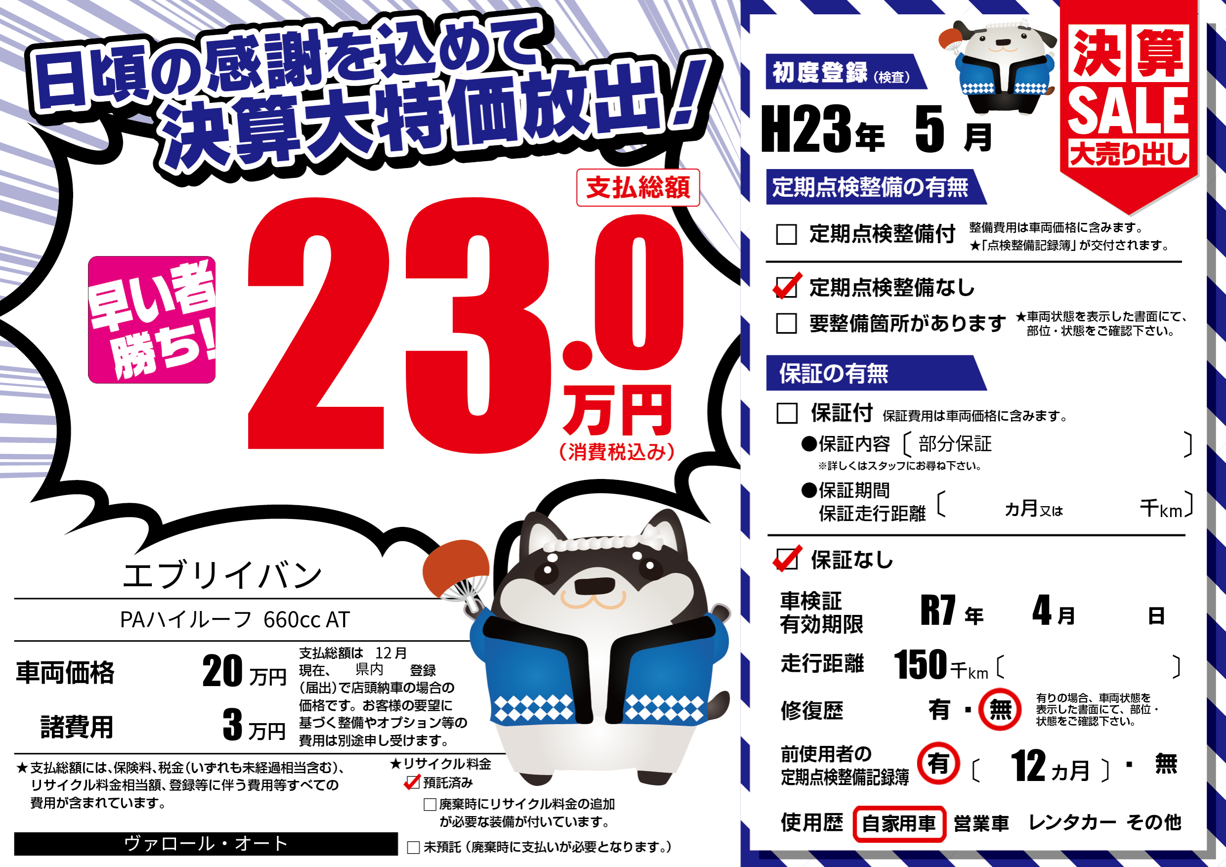 | 走行キロ | 15万km | 初年度登録 | H23年5月 |