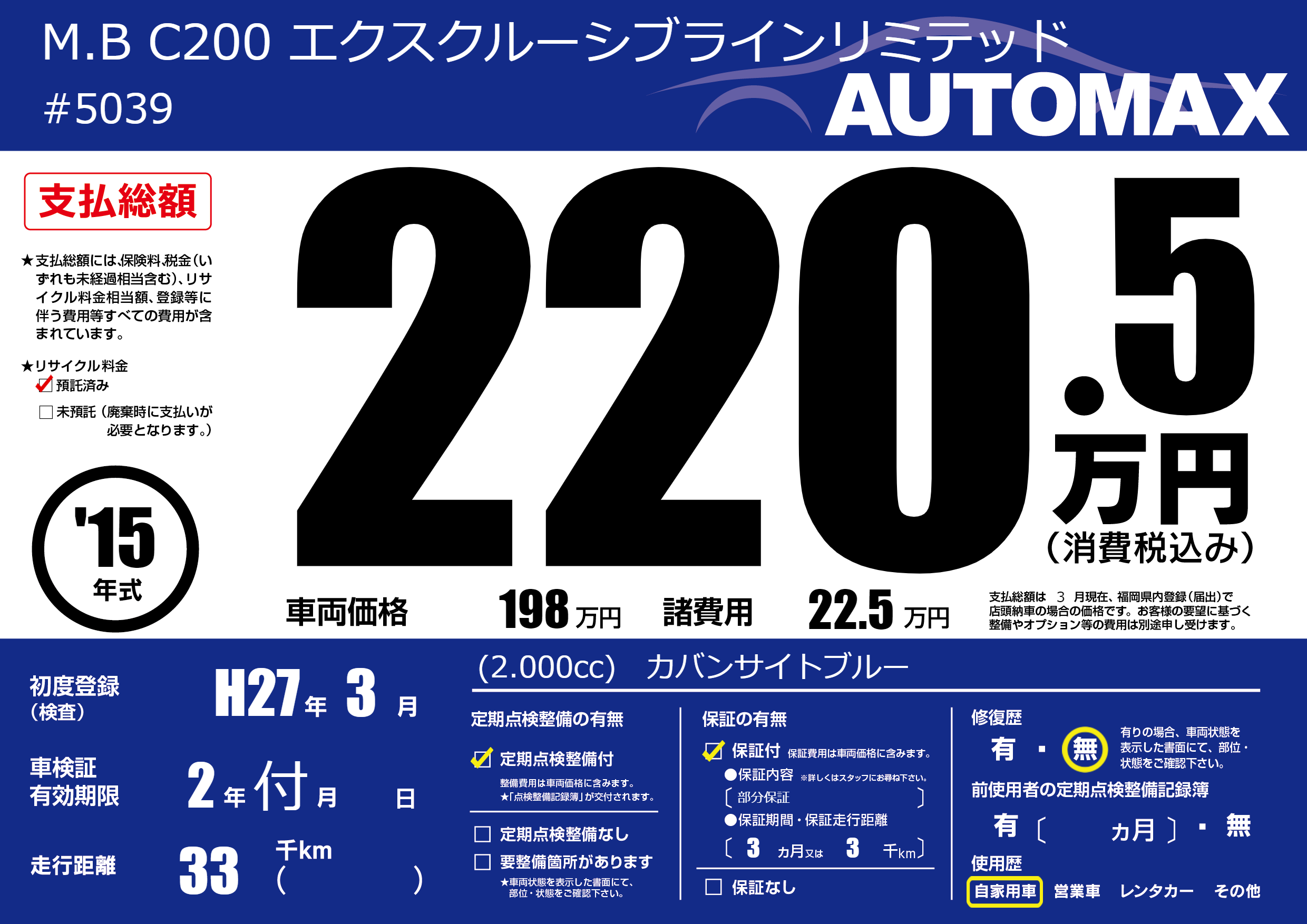 | 車名 | M.B C200 エクスクルーシブラインリミテッド | グレード ミッション 排気量 |