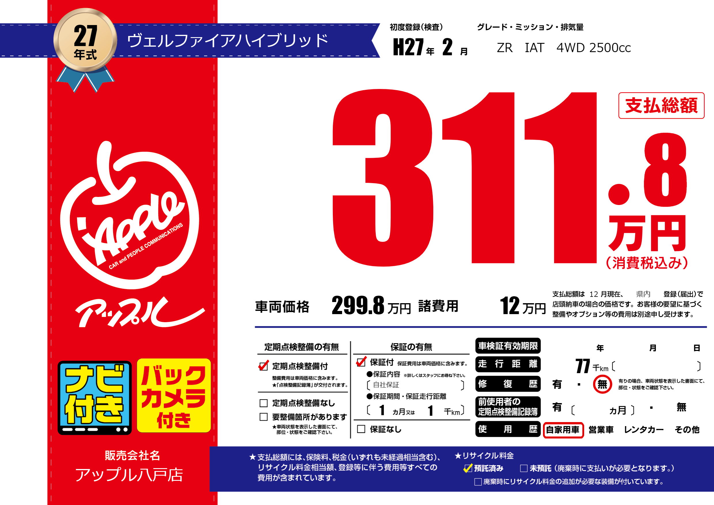 | 走行キロ | 7.7万km | 初年度登録 | H27年2月 |