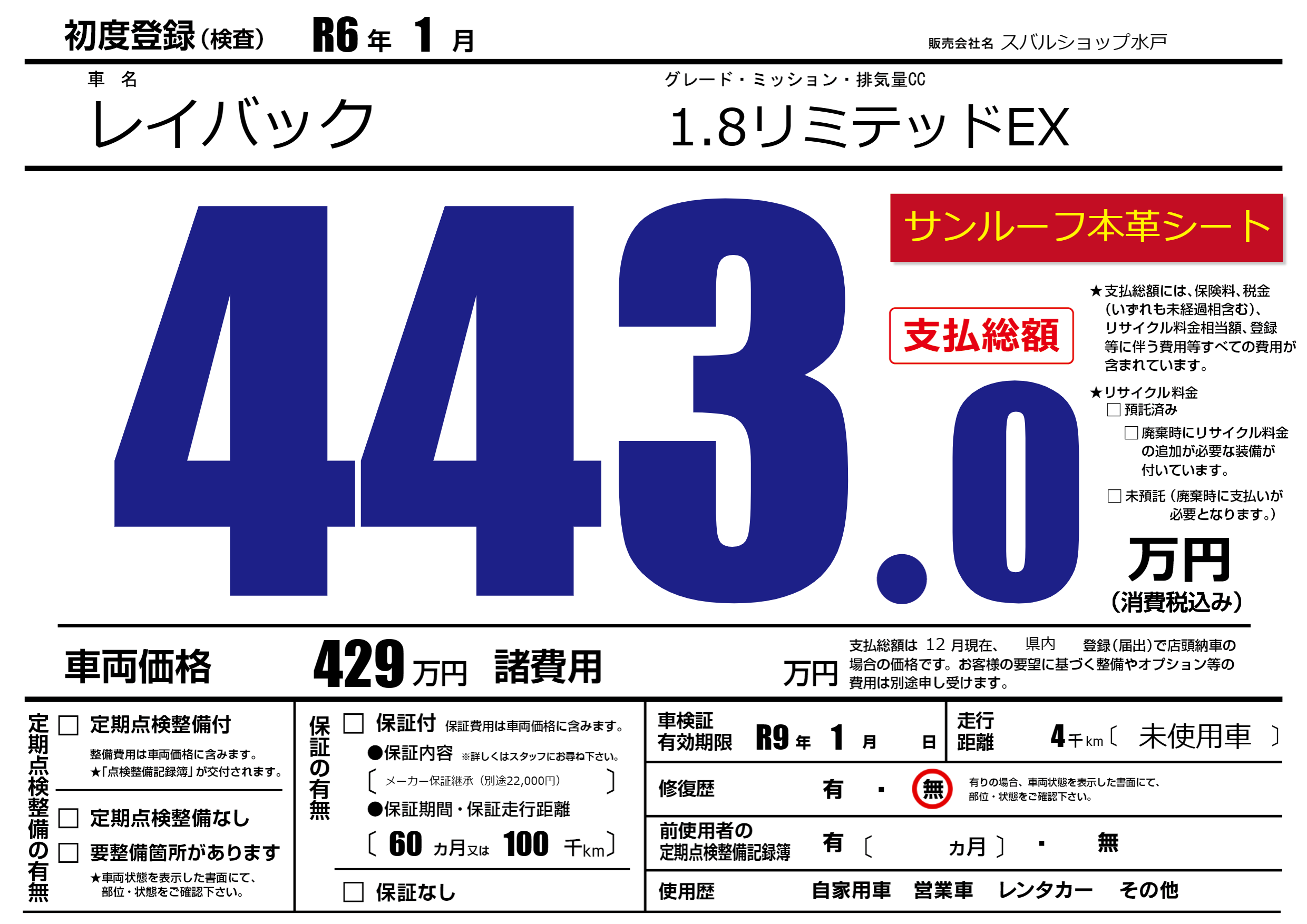 | 車名 | レイバック | グレード ミッション 排気量 |