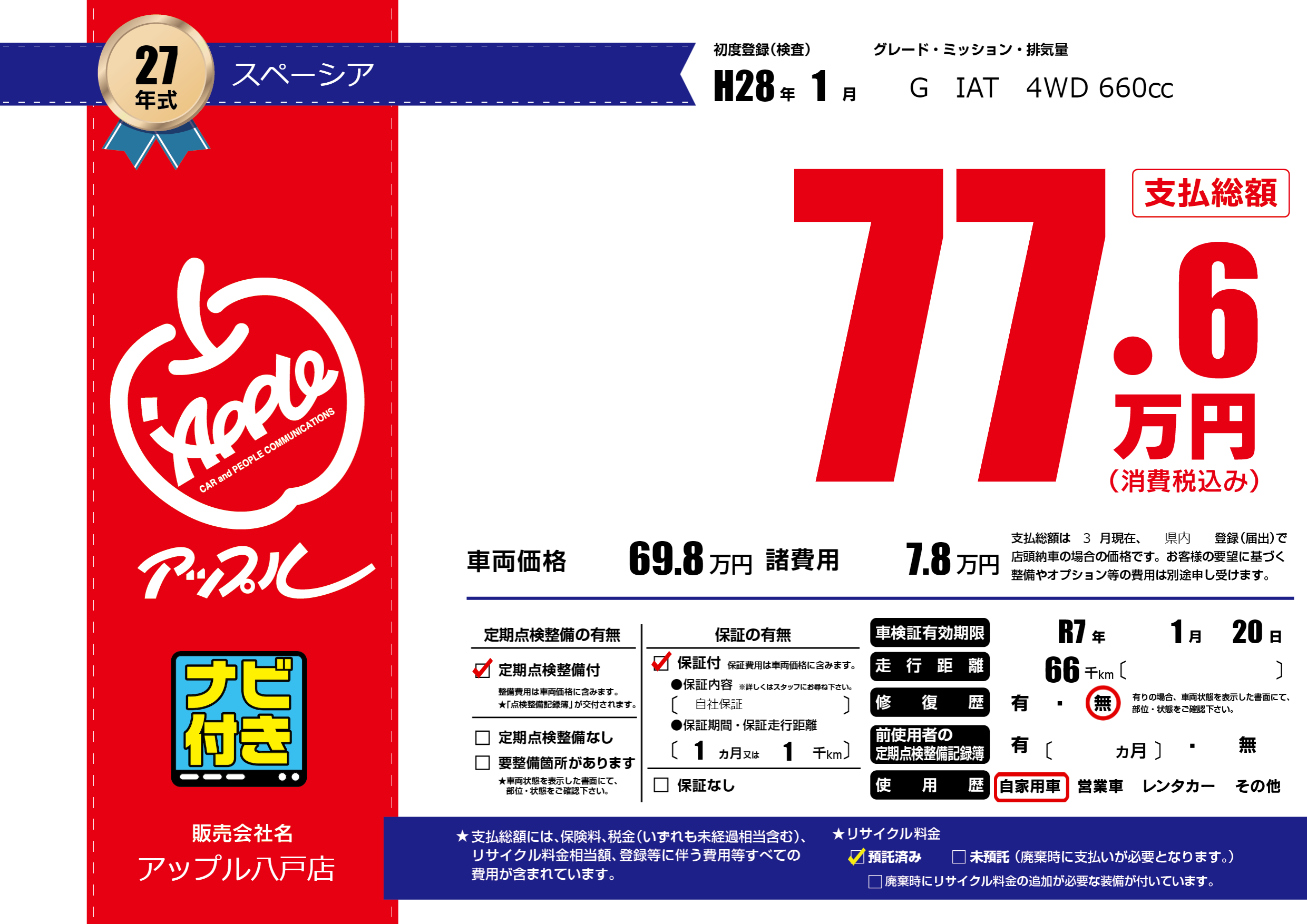| 車検制限 | R7年 1月 20日 | ||