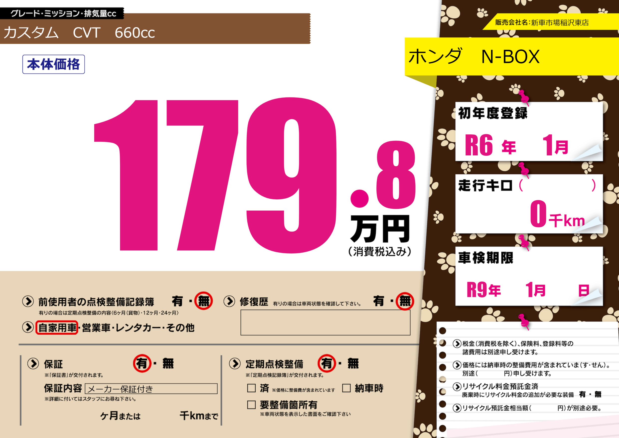 | 車名 | ホンダ N-BOX | グレード ミッション 排気量 |