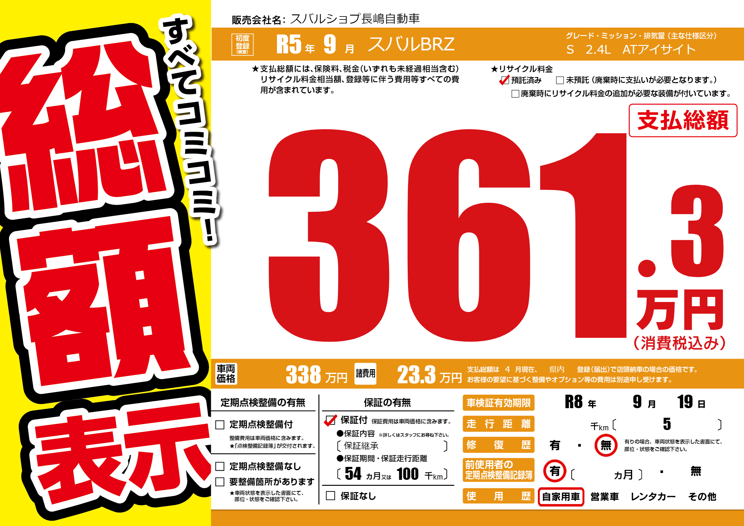| 車名 | スバルBRZ | グレード ミッション 排気量 |