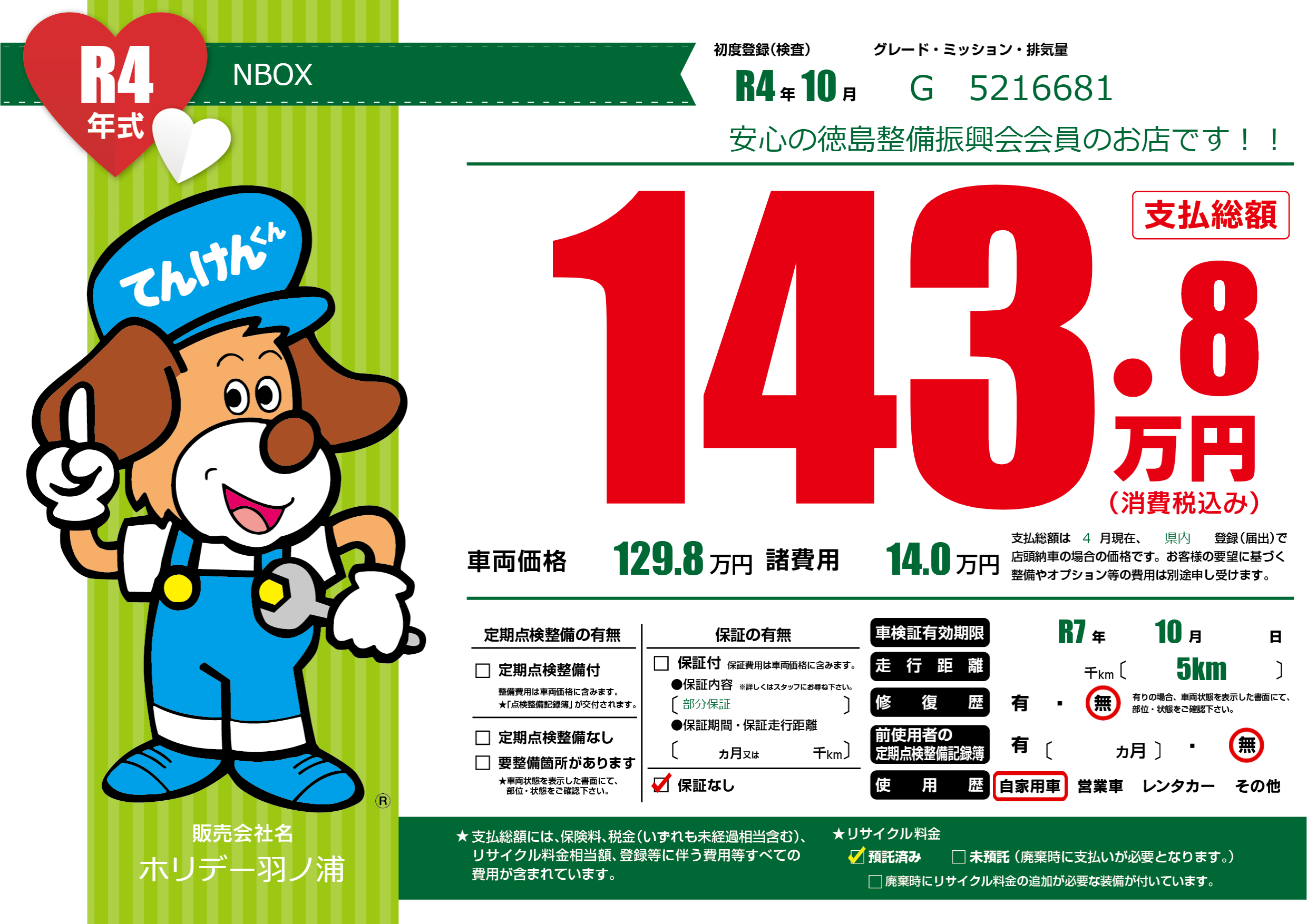 | 車名 | NBOX | グレード ミッション 排気量 |