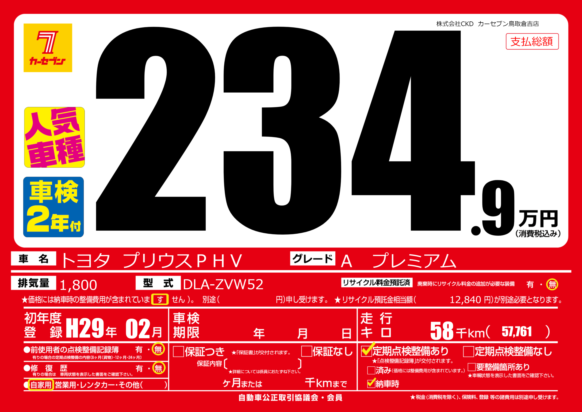 | 車名 | トヨタ プリウスPHV | グレード ミッション 排気量 |