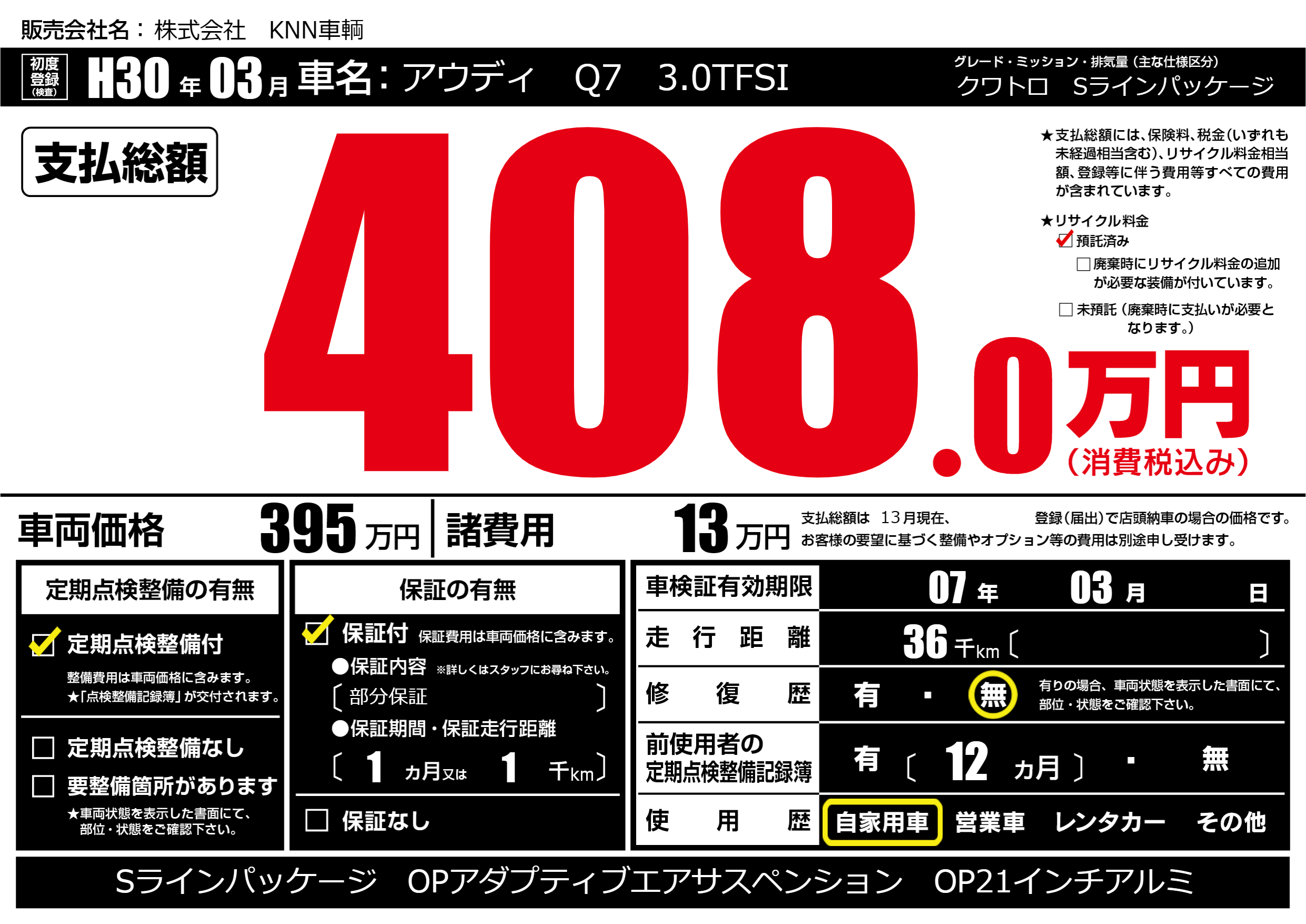 | 車名 | アウディ Q7 3.0TFSI | グレード ミッション 排気量 |