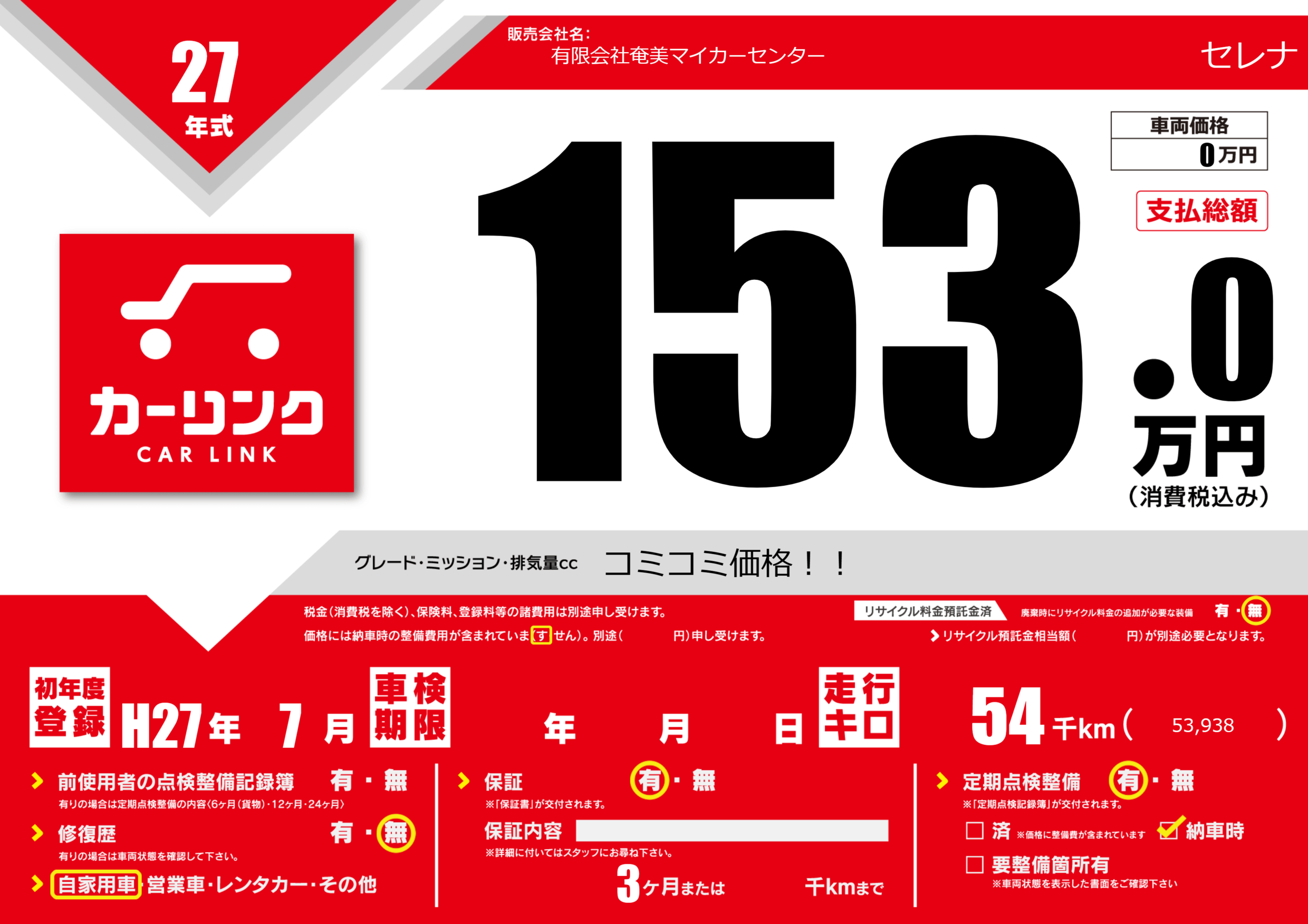 | 走行キロ | 5.4万km | 初年度登録 | H27年7月 |