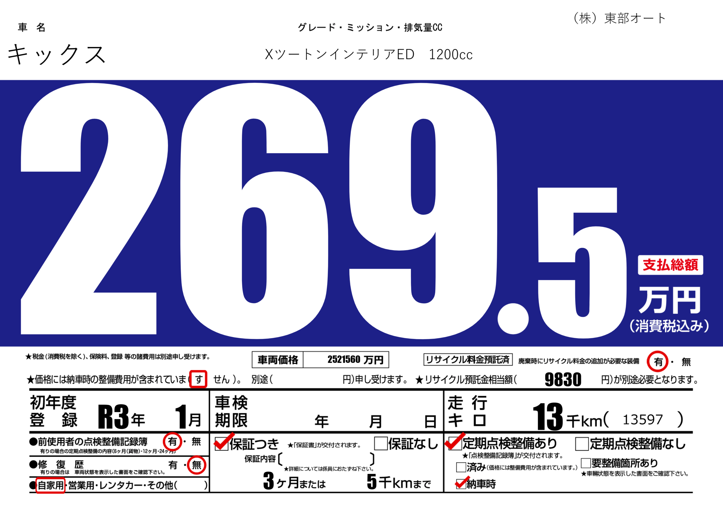 | 定期点検整備 | 定期点検整備あり 納車時あり | ||