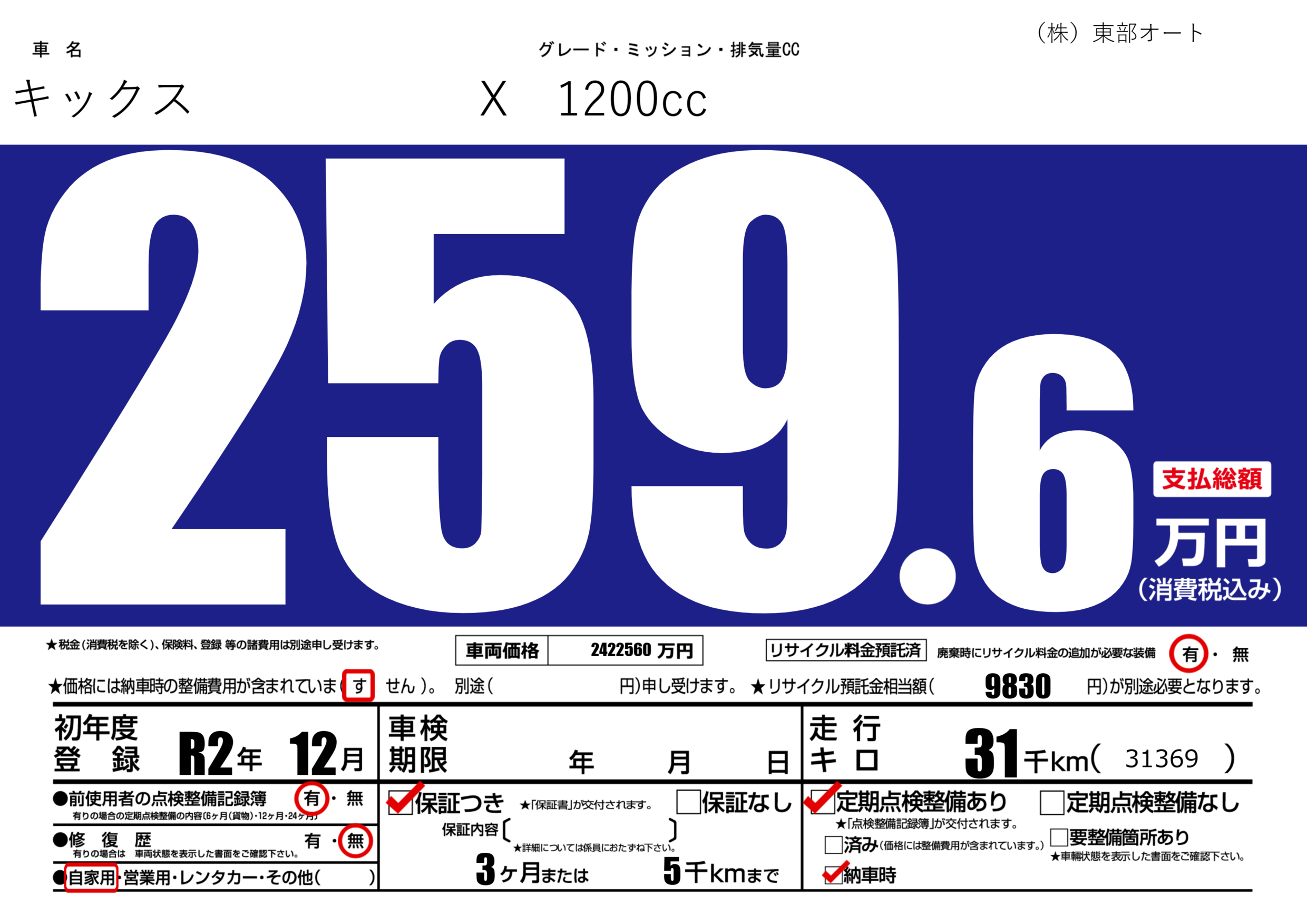 | 定期点検整備 | 定期点検整備あり 納車時あり | ||