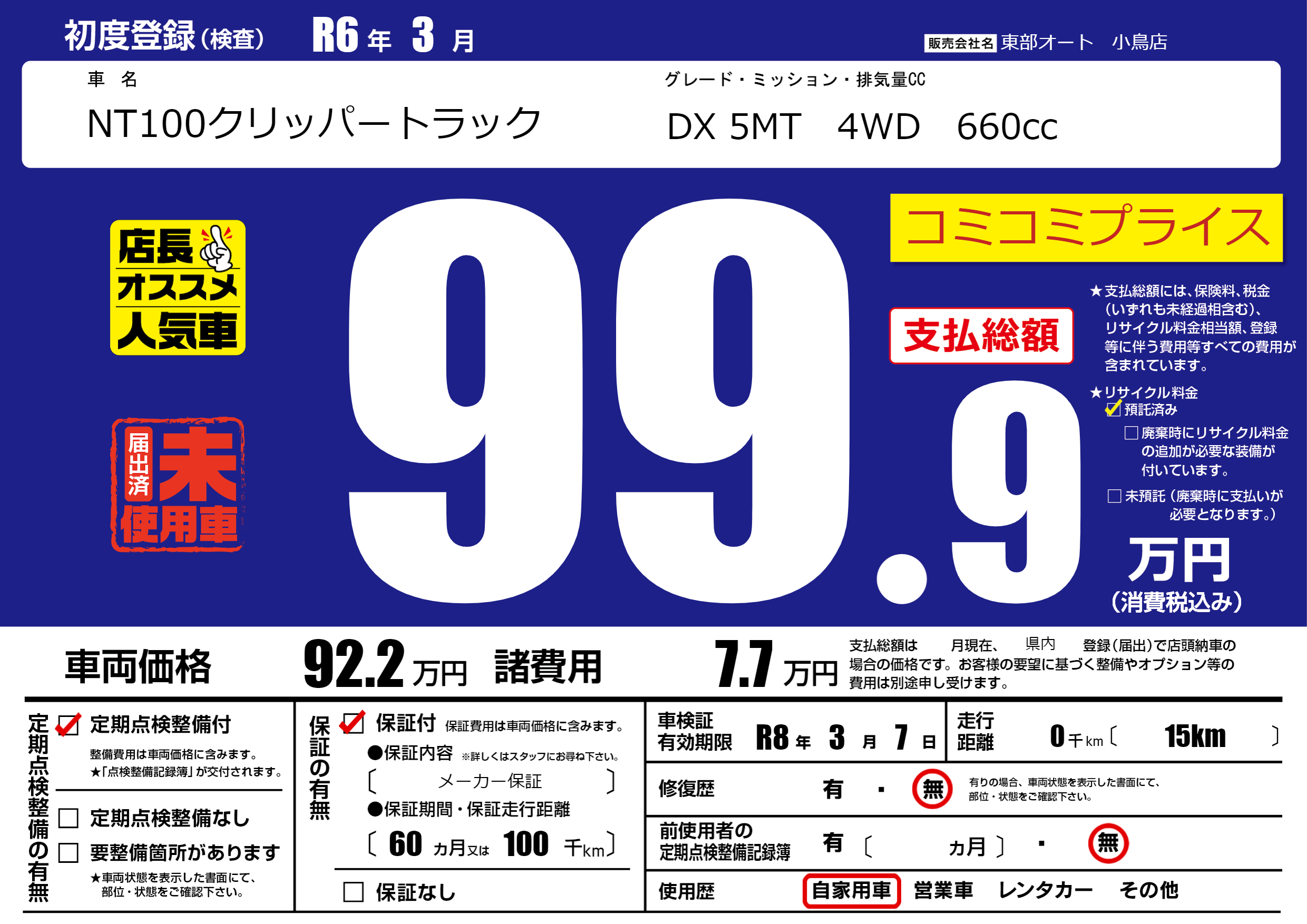 | 車名 | NT100クリッパートラック | グレード ミッション 排気量 |