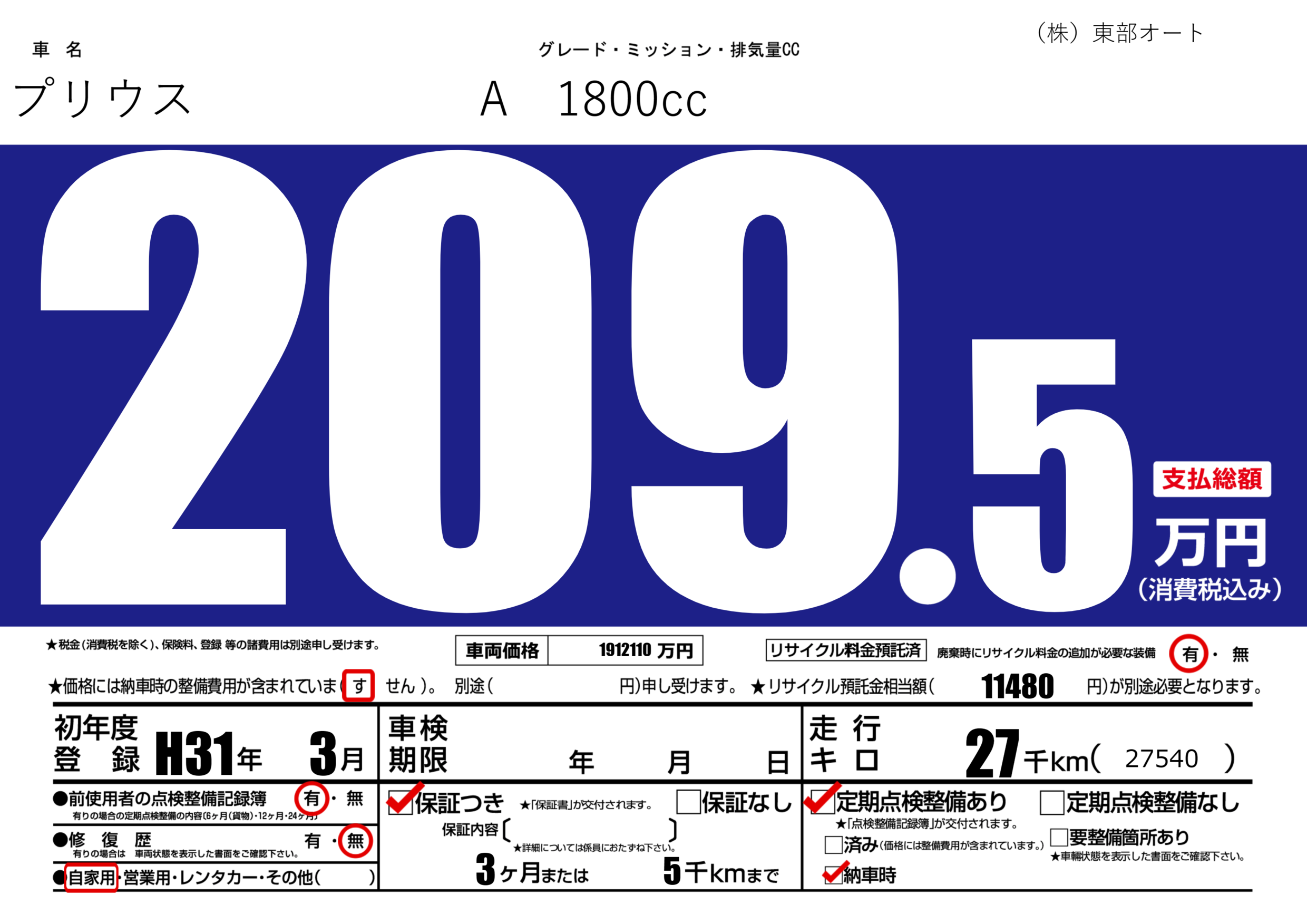 | 車名 | プリウス | グレード ミッション 排気量 |