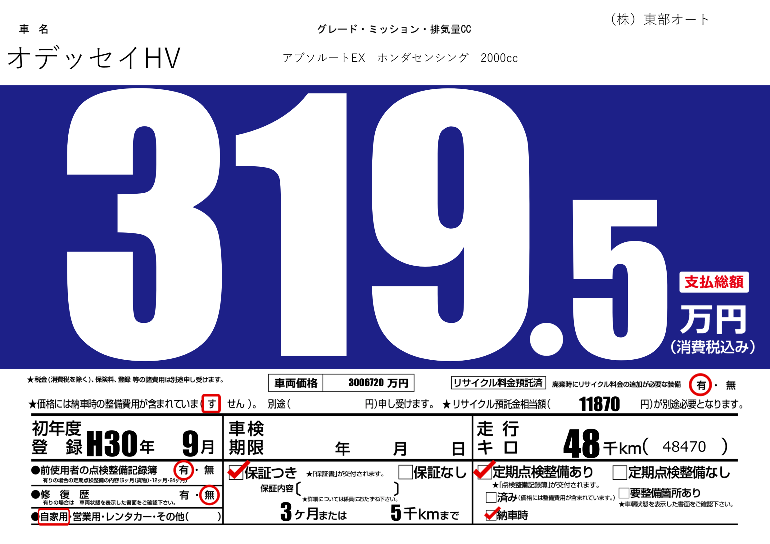 | 車名 | オデッセイHV | グレード ミッション 排気量 |
