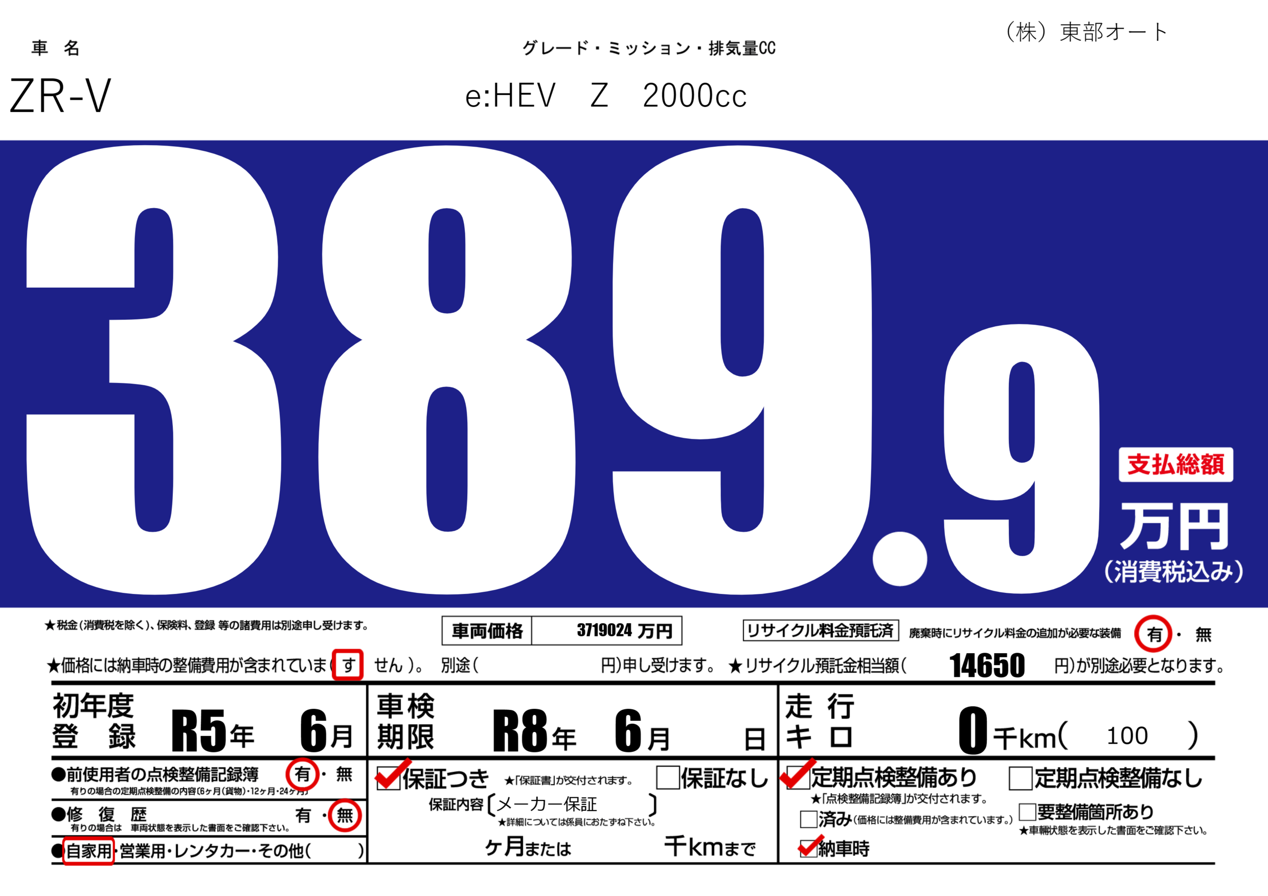 | 車名 | ZR-V | グレード ミッション 排気量 |