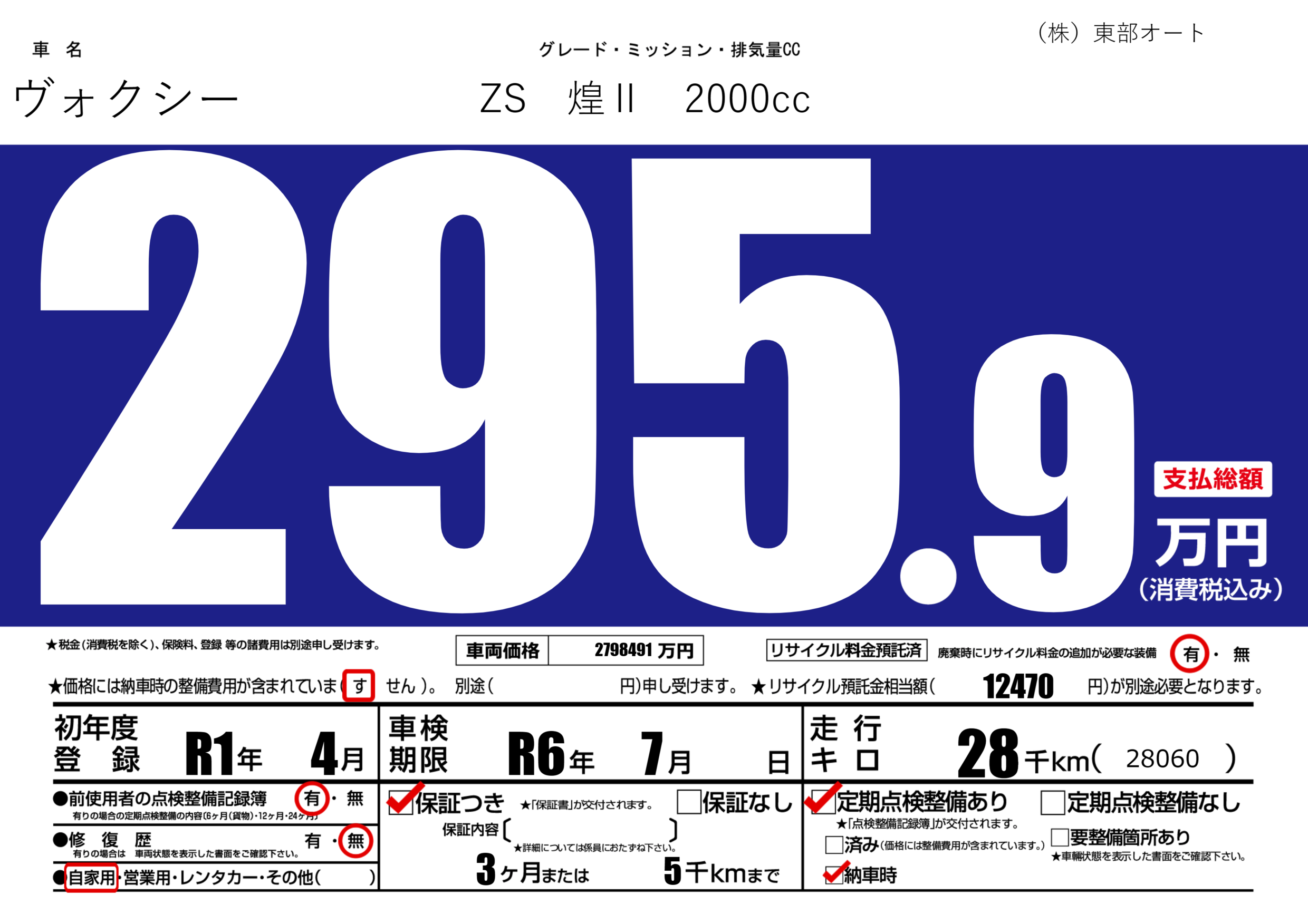 | 車名 | ヴォクシー | グレード ミッション 排気量 |