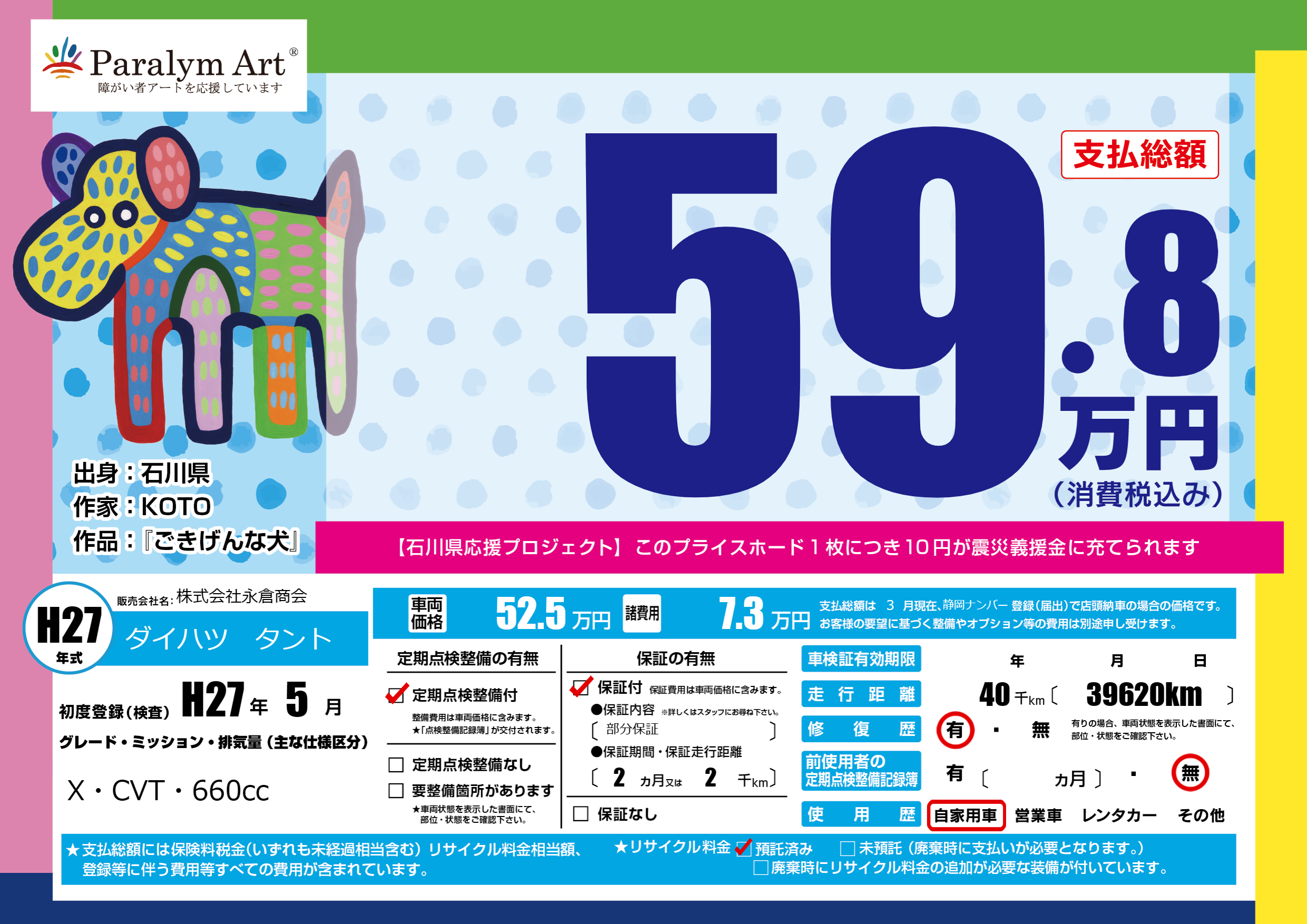 | 車名 | ダイハツ タント | グレード ミッション 排気量 |