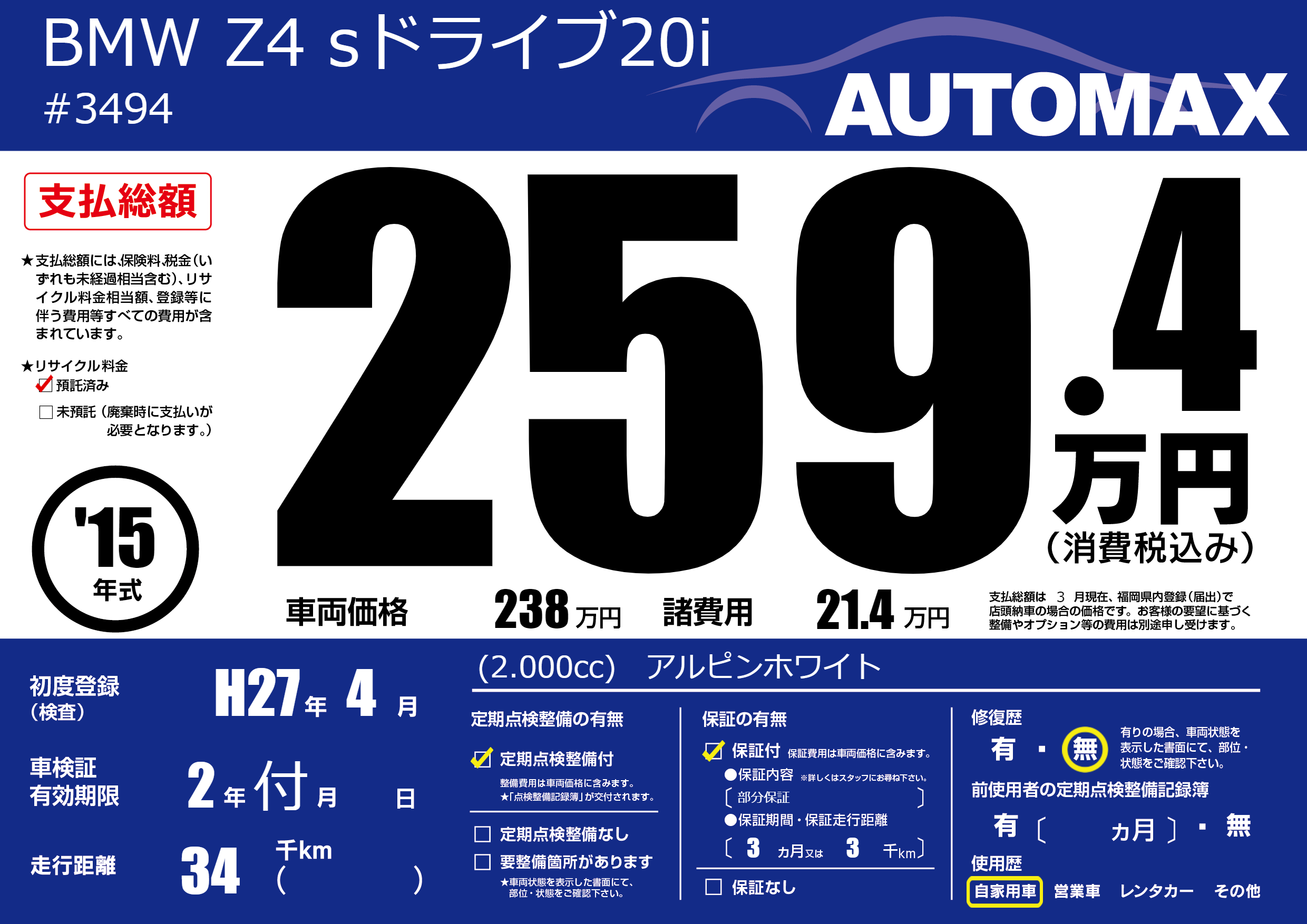 | 車名 | BMW Z4 sドライブ20i | グレード ミッション 排気量 |