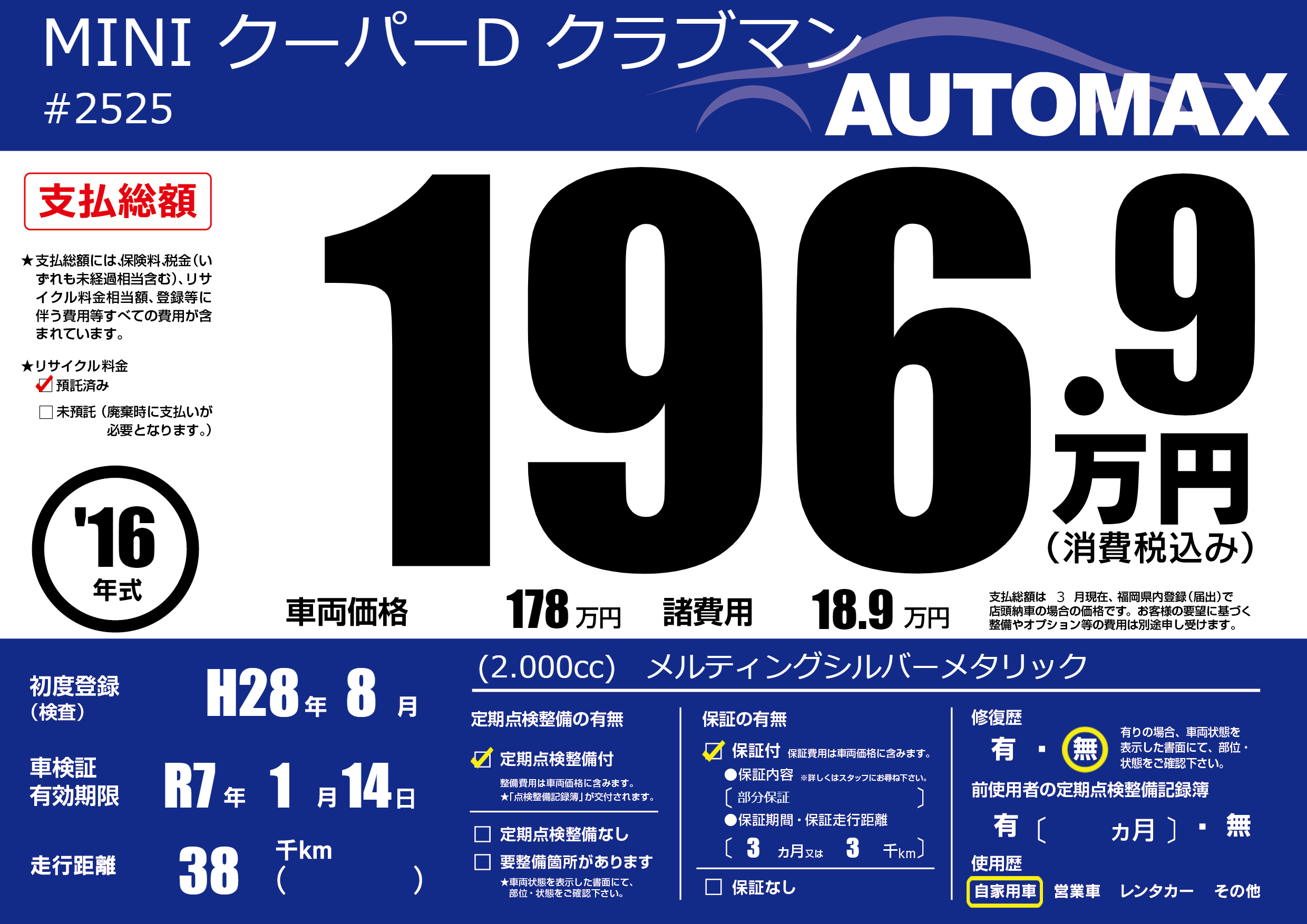 | 車名 | MINI クーパーD クラブマン | グレード ミッション 排気量 |