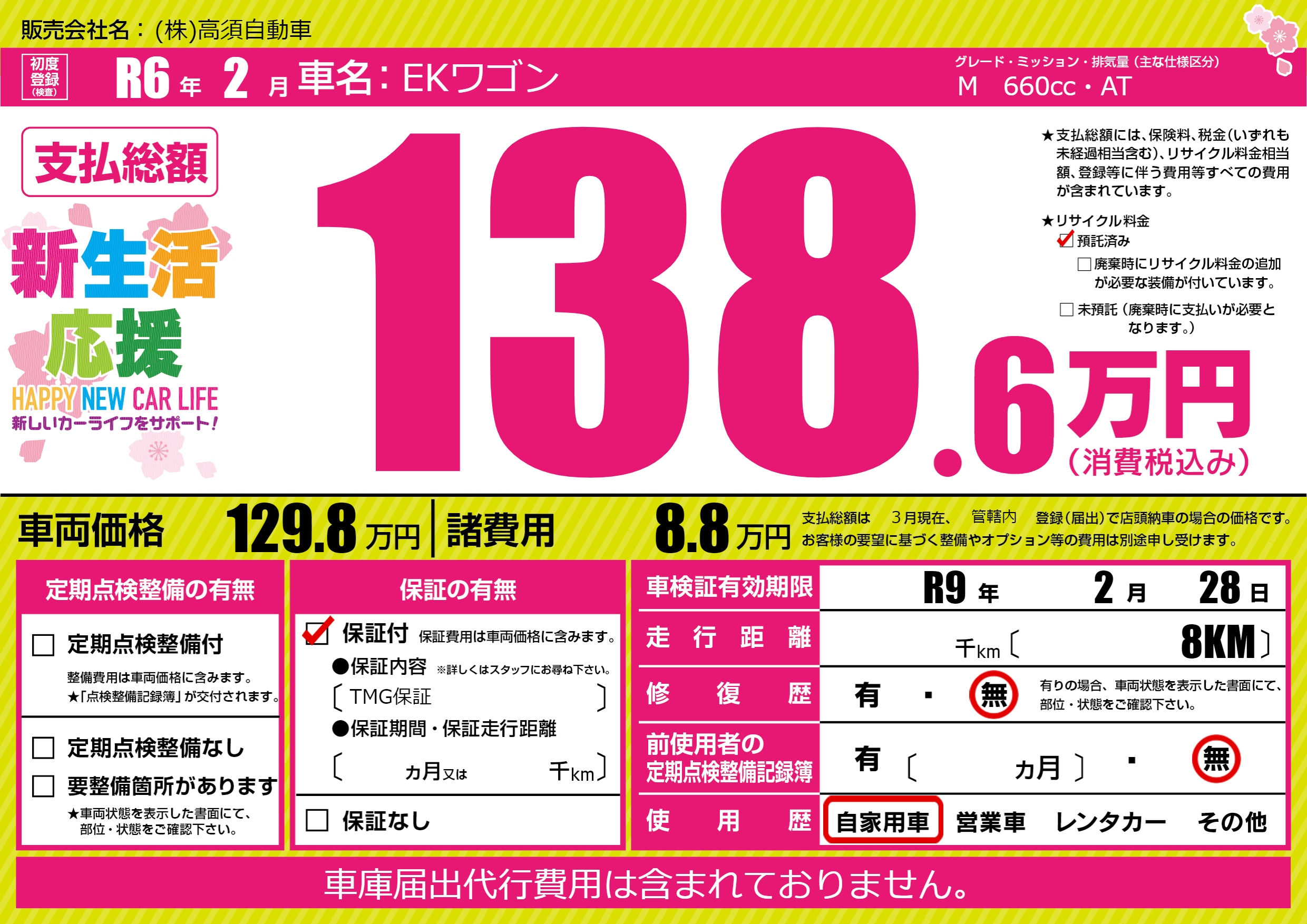 | 車名 | EKワゴン | グレード ミッション 排気量 |