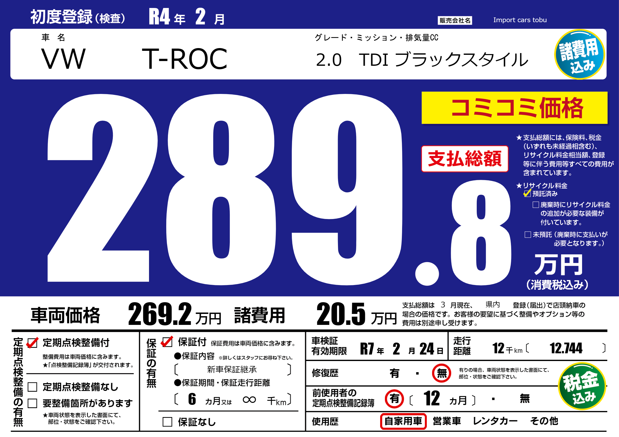保証付き 保証内容( 新車保証継承) 6ヶ月または∞千km |