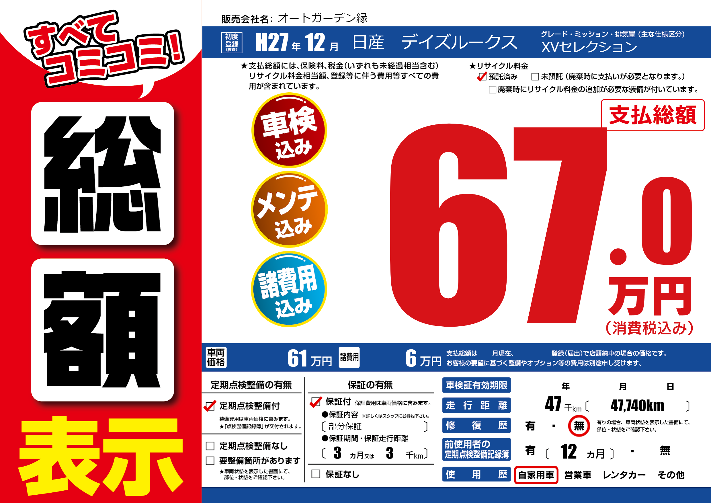 | 車名 | 日産 デイズルークス | グレード ミッション 排気量 |