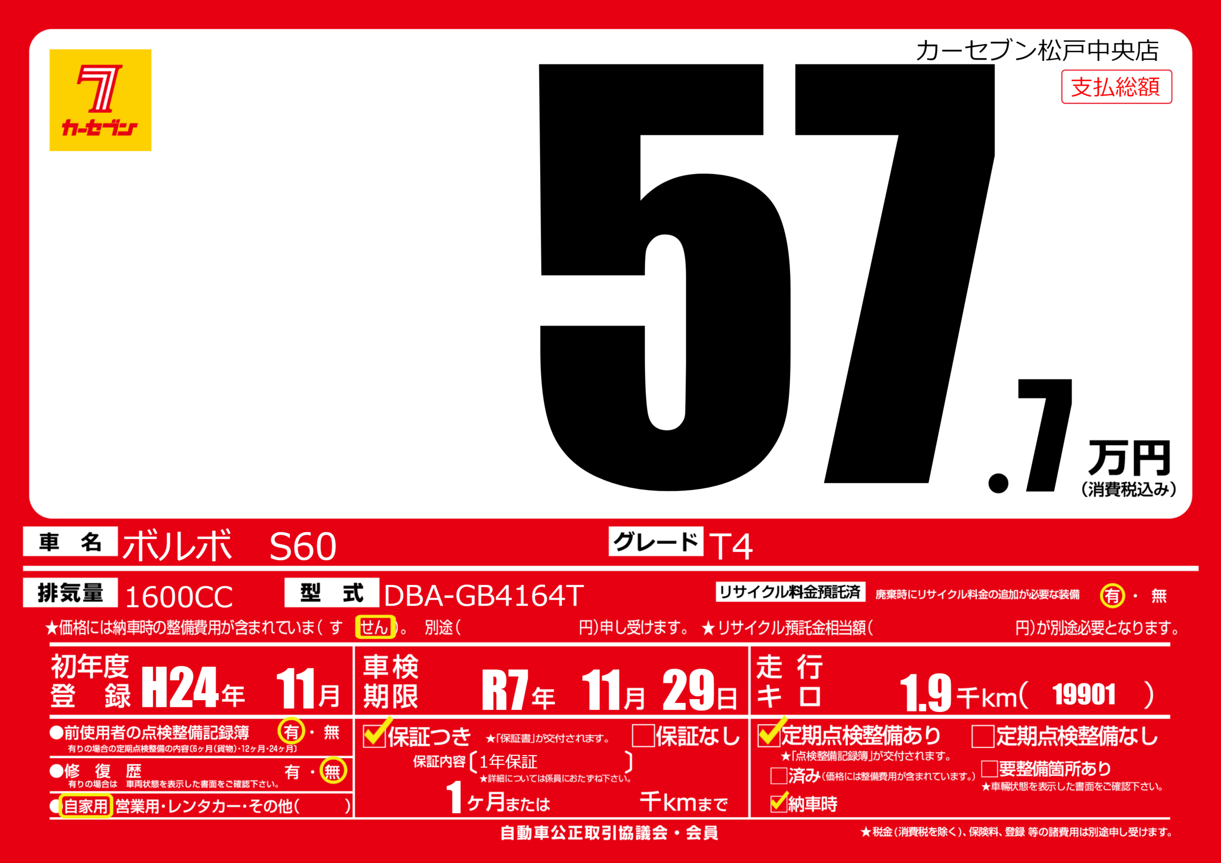| 車名 | ボルボ S60 | グレード ミッション 排気量 |