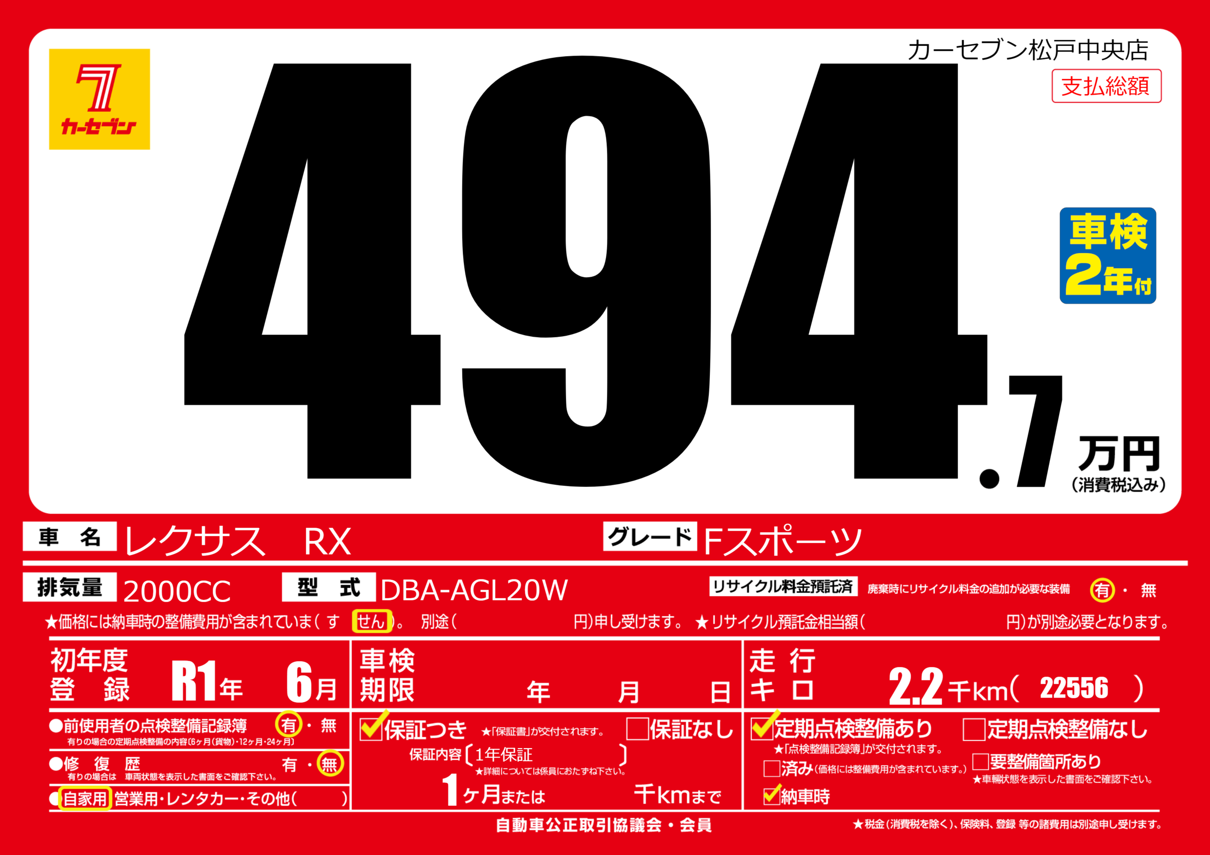 | 車名 | レクサス RX | グレード ミッション 排気量 |