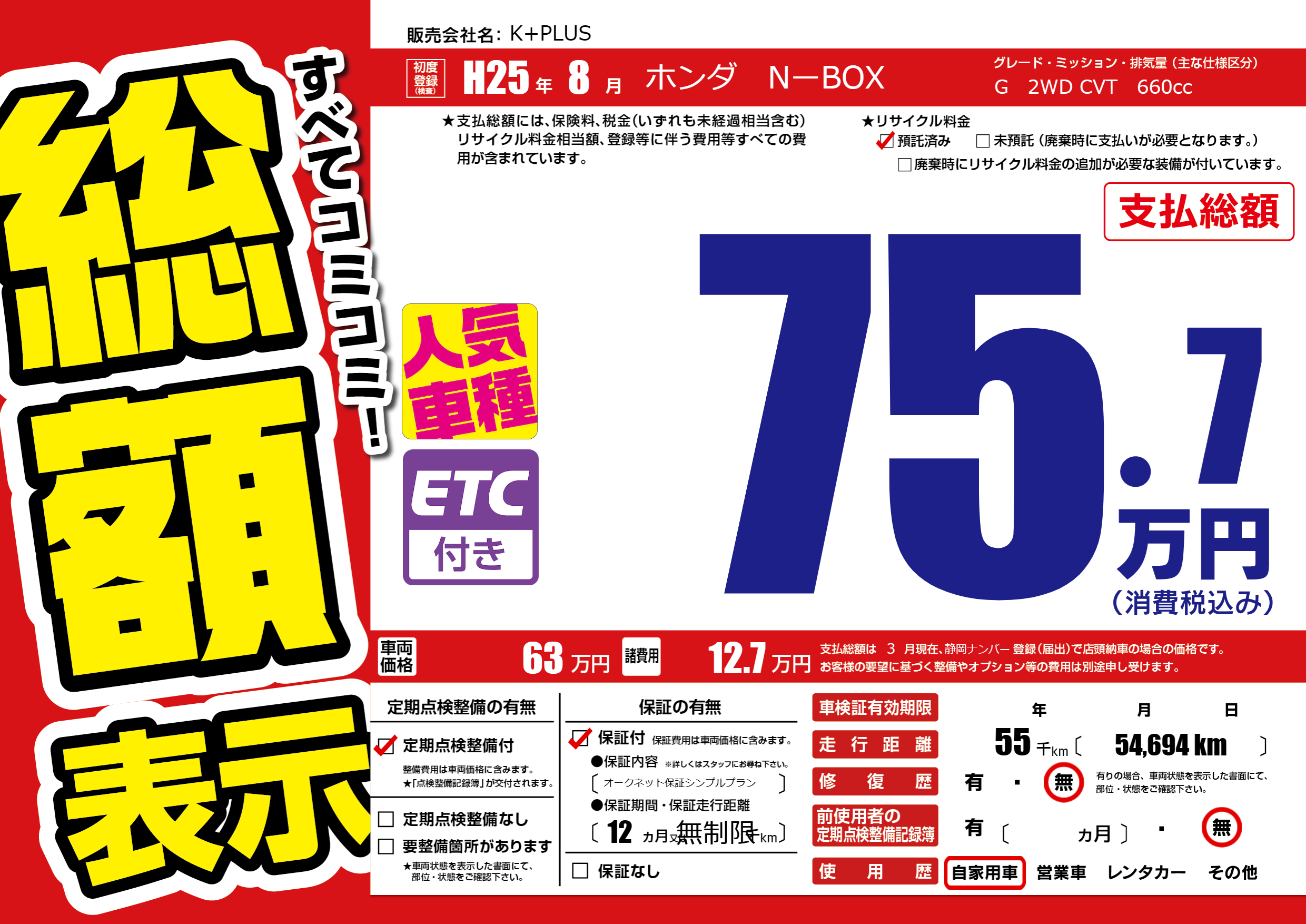 | 車名 | ホンダ NーBOX | グレード ミッション 排気量 |