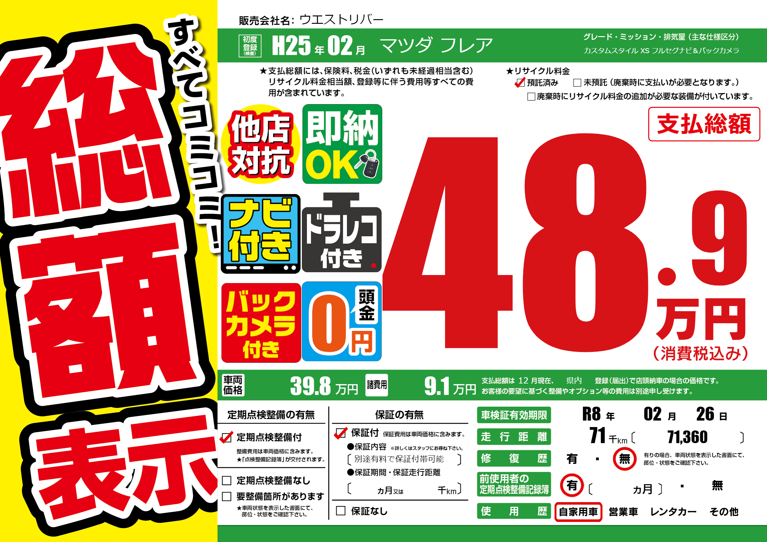 | 走行キロ | 7.1万km | 初年度登録 | H25年02月 |