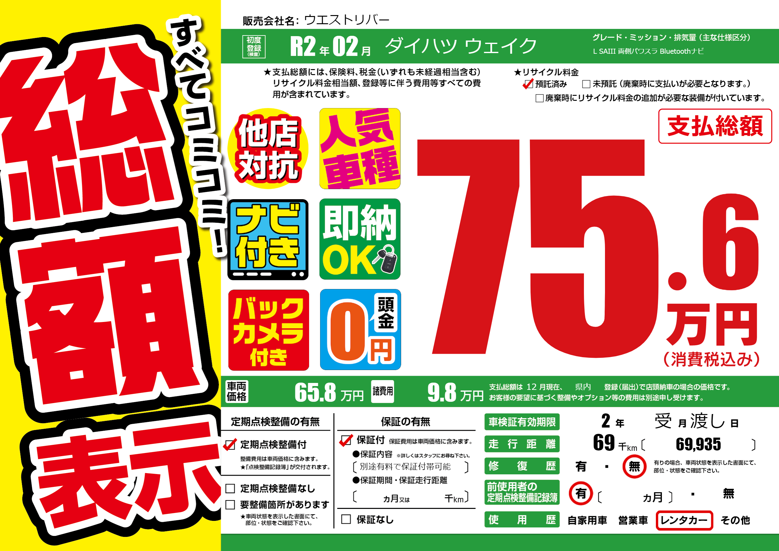 | 車名 | ダイハツ ウェイク | グレード ミッション 排気量 |